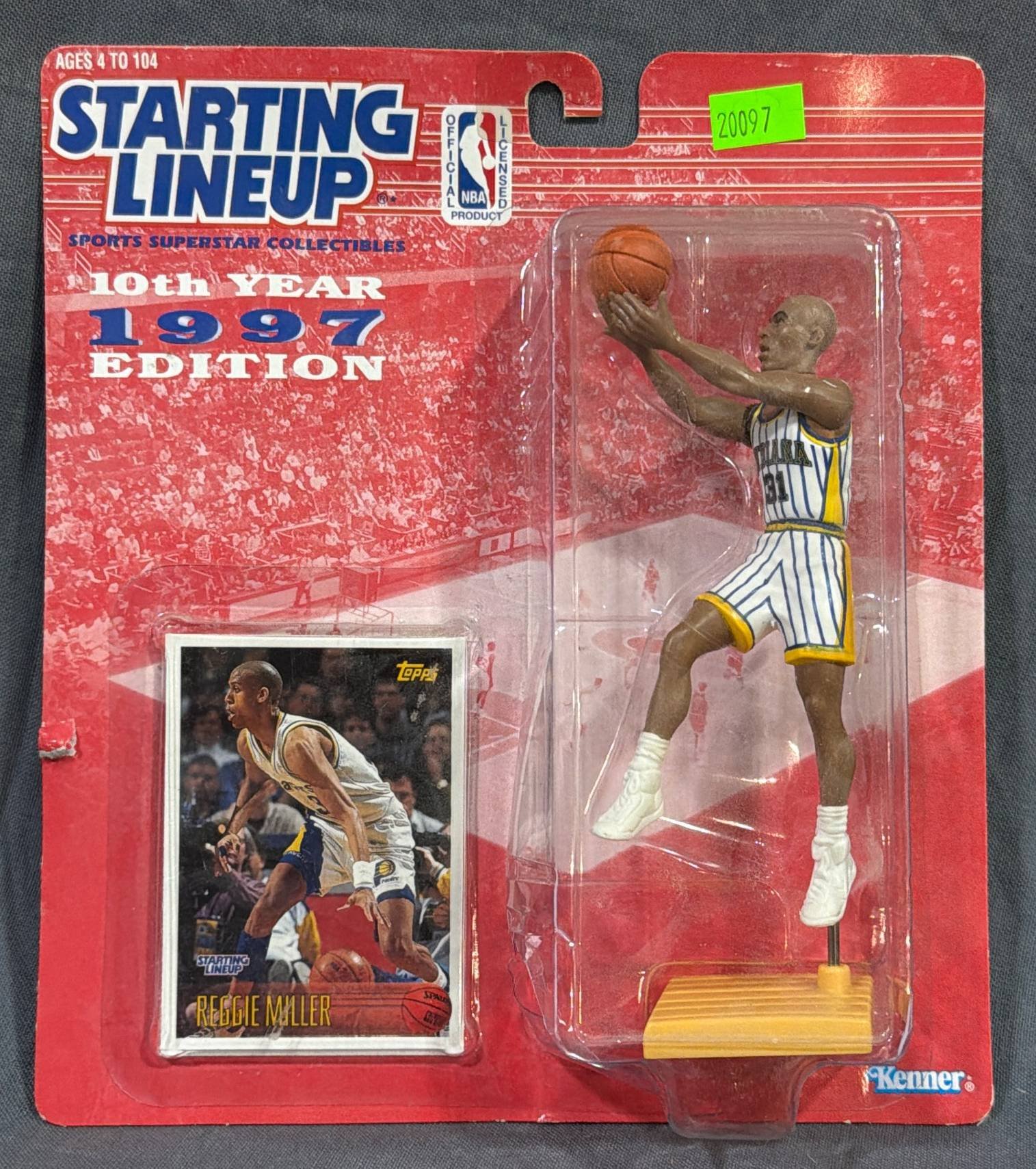 20097 1997 Kenner Starting Lineup Reggie Miller Basketball Figurine with Trading Card 7”H