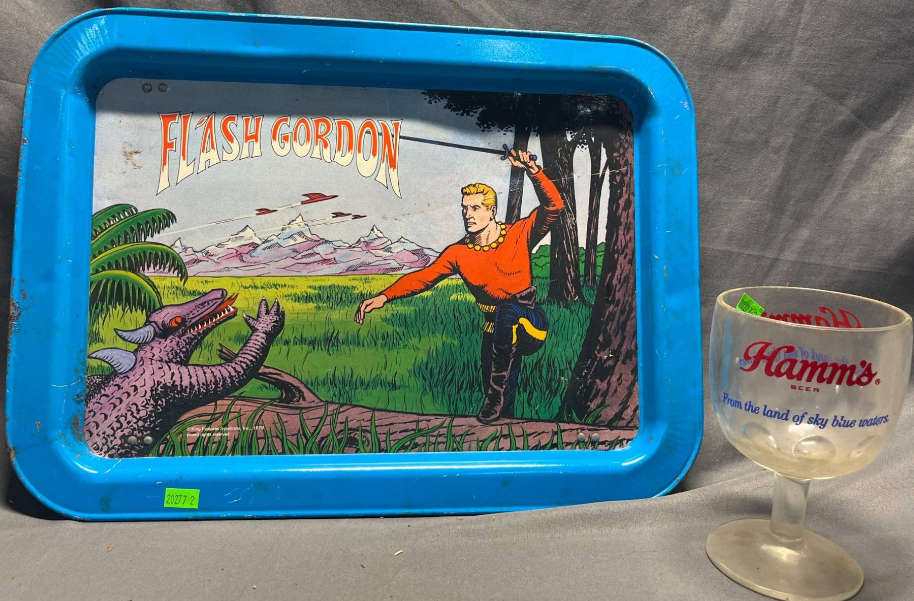 20277 1979 Flash Gordon Metal Tray and Hamm’s Beer Goblet