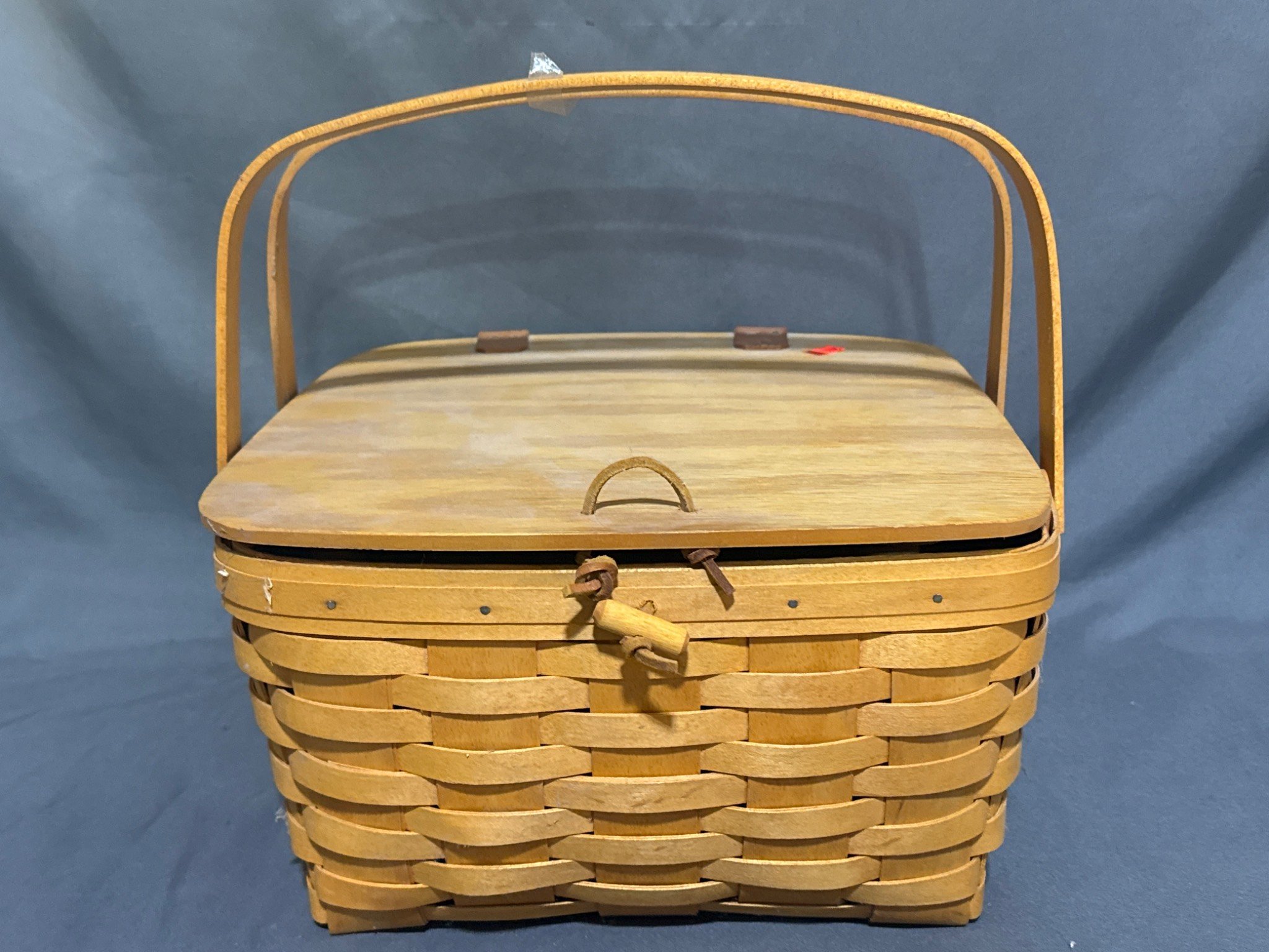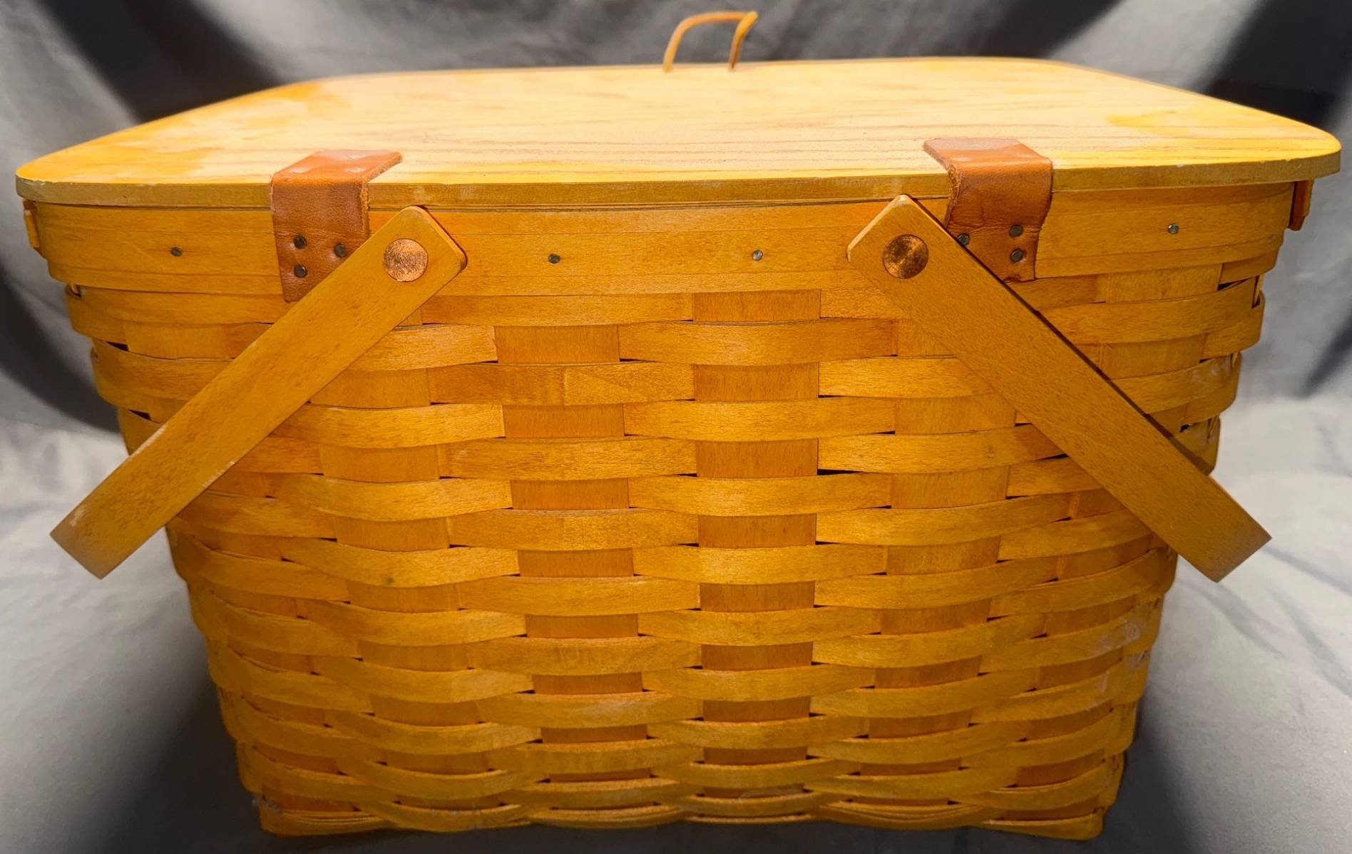 20302 1991 Longaberger Woven Basket with Hinged Lid and Folding Handles 17”