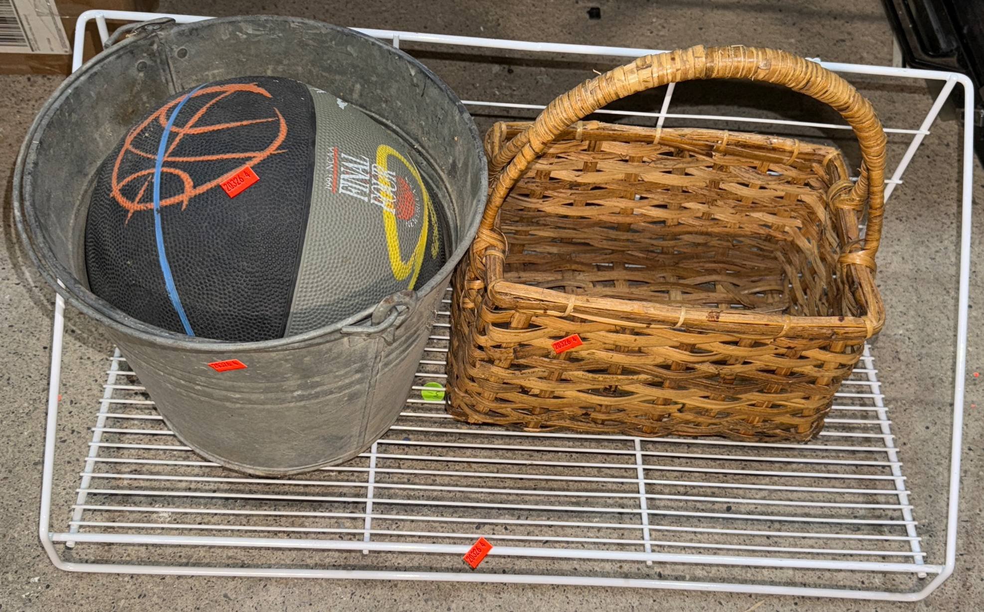 20326 Galvanized Metal Bucket, Woven Basket, Basketball & Metal Wire Shelf 25” x 14”