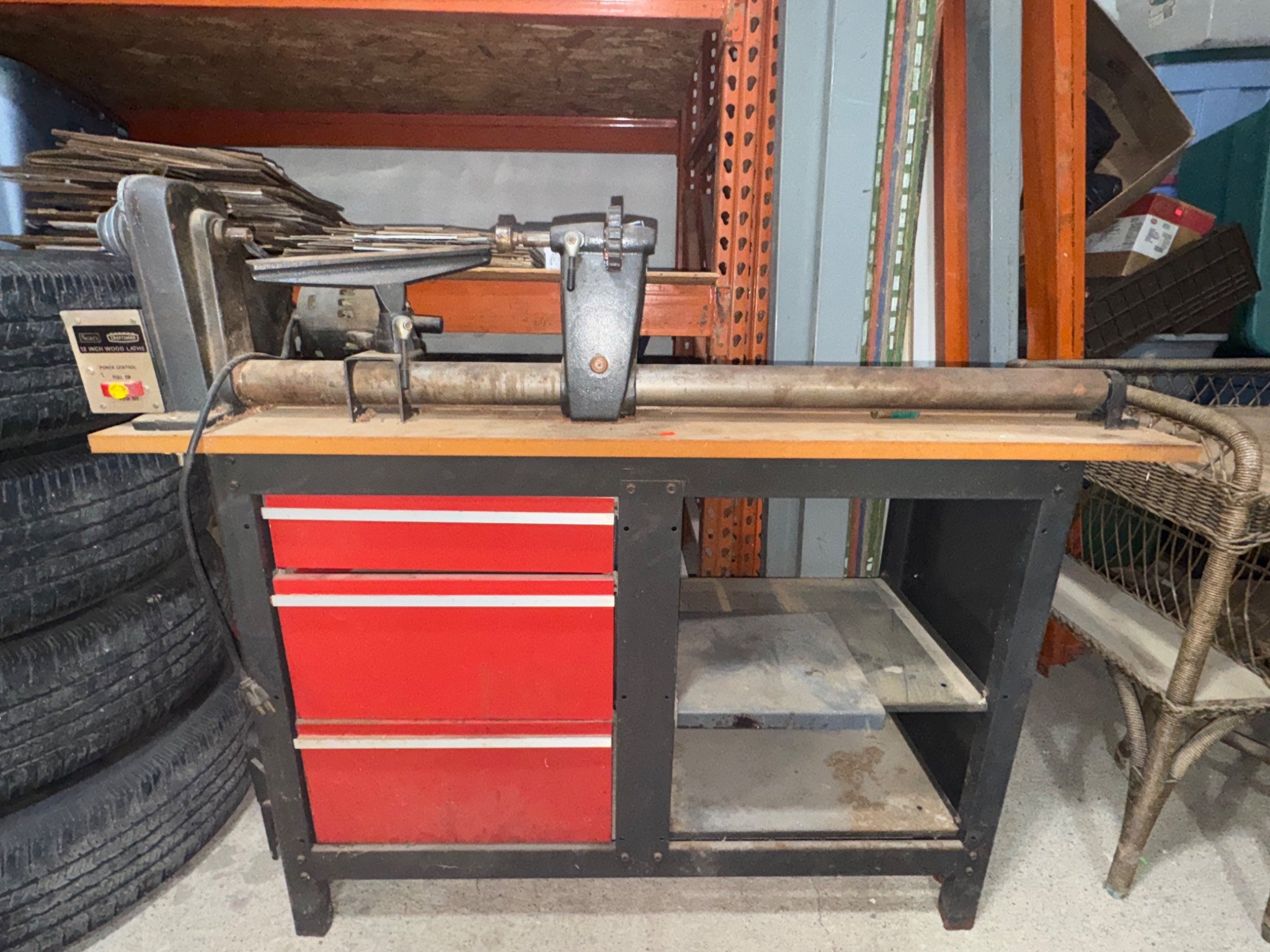 20334 Metal Lathe on Workbench with Red Drawer Storage and Accessories 54x 18 x 33 (contents included)