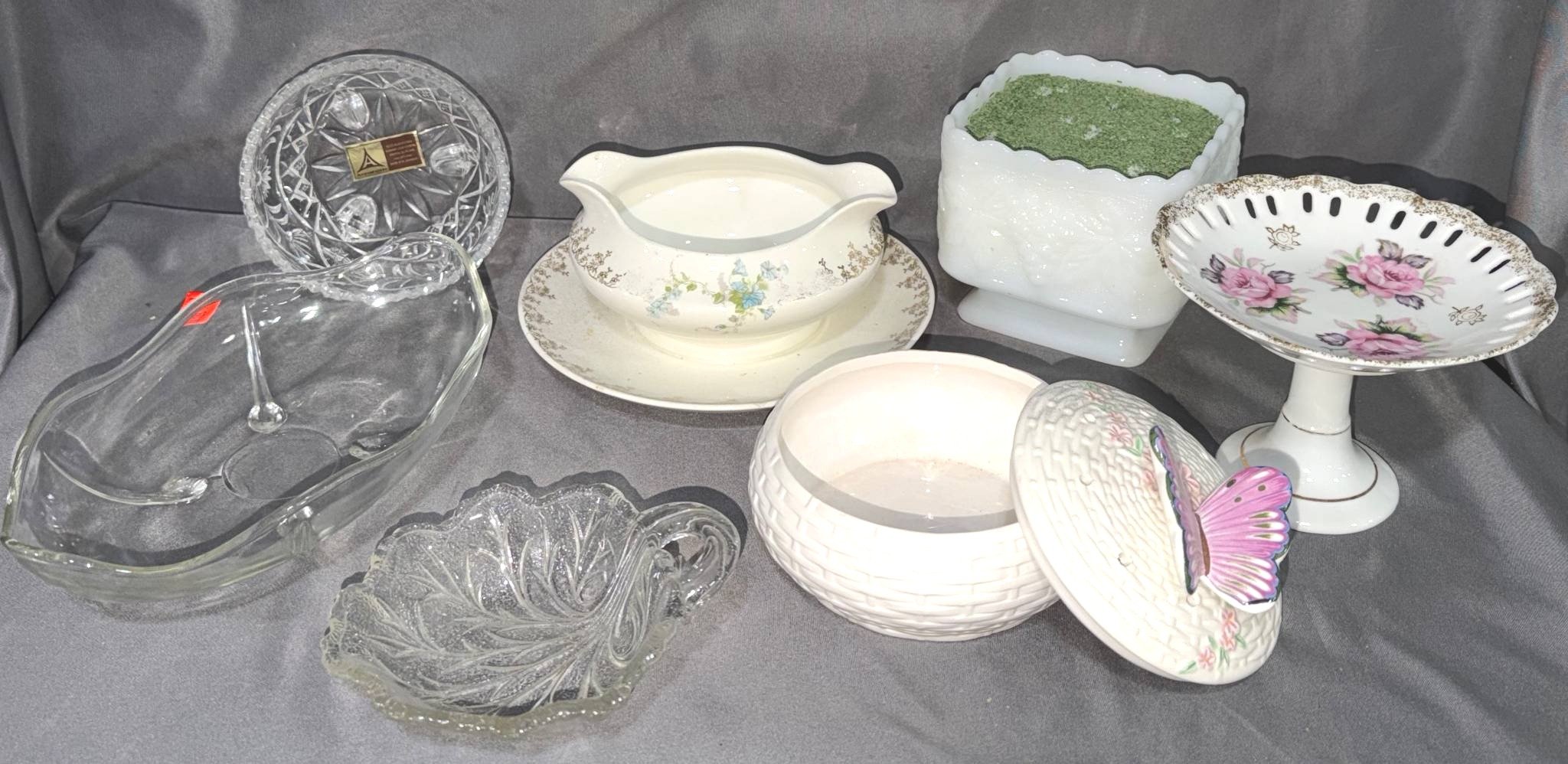 20347 Tableware With Butterfly Motif & Floral Designs Inc. Serving Dishes, Compote, Milk Glass Planter and More, 4” – 9”