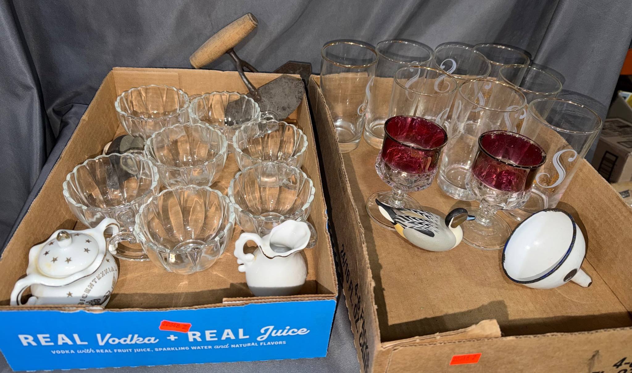 20348 Ruby Flashed Glass Goblets, Gold-Tone Rimmed Tumblers with ‘S’ Design, Creamer, Sugar and Figurines, 2.5” – 5.2” H