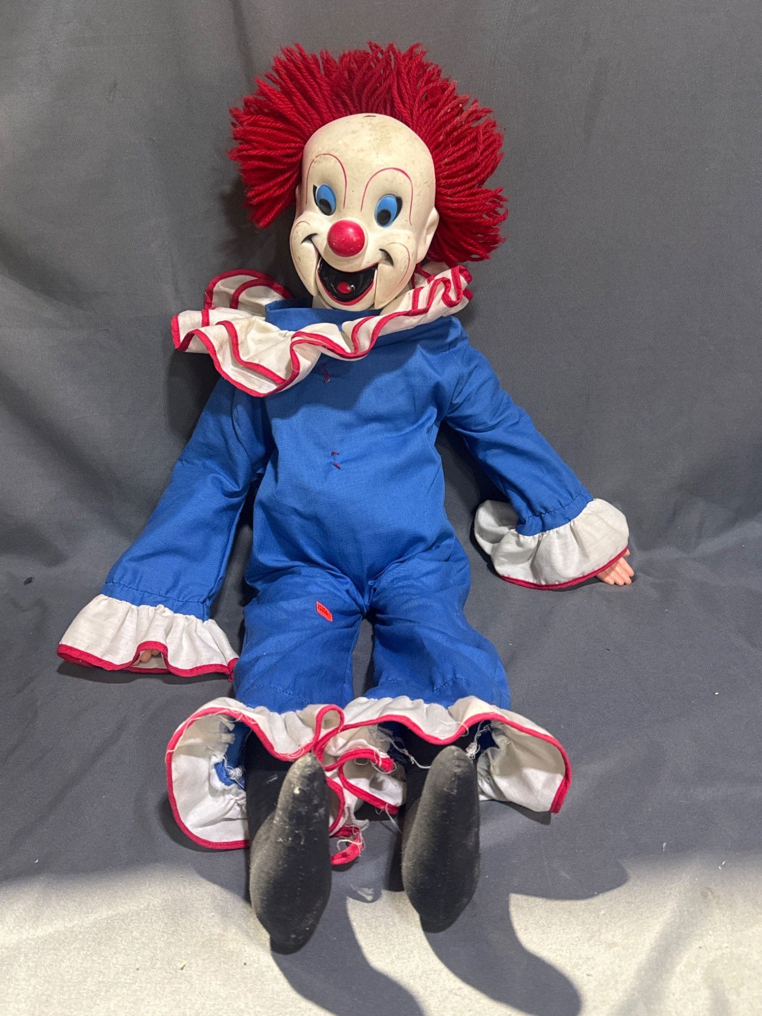 20356 Egge Co. Bozo the Clown Ventriloquist Doll with Red Hair, Blue Outfit, and Plastic Face, 14” x 5” x 31”