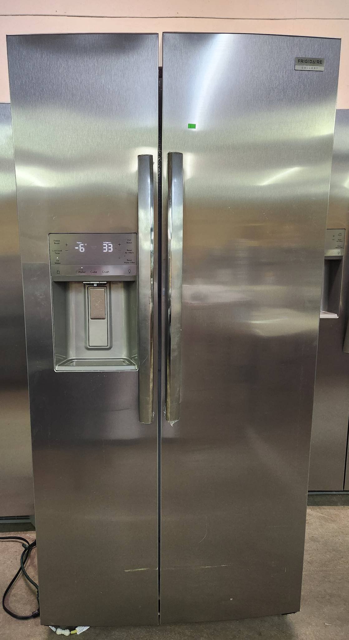 7 Frigidaire Gallery 36 in. 22.3 cu. ft. Counter Depth Side-by-Side Refrigerator in Smudge-Proof Stainless Steel, ENERGY STAR model # GRSS2352AFB has minor dings and scuffing