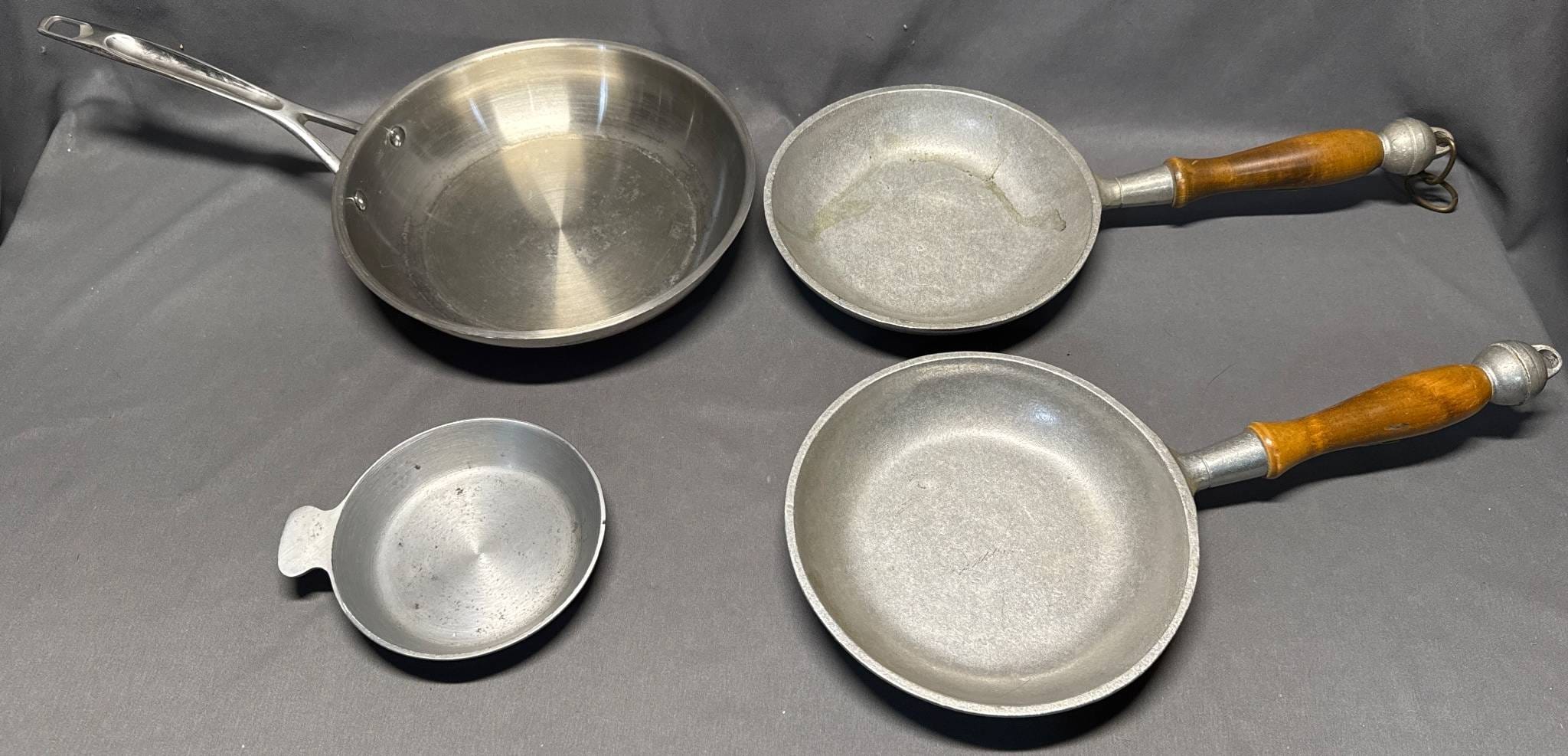 10226 Cast Iron and Metal Frying Pans with Wood Handles and Markings Inc. Griswold and Wilton Armetale Skillet, 5”, 8”, 8”, 10”