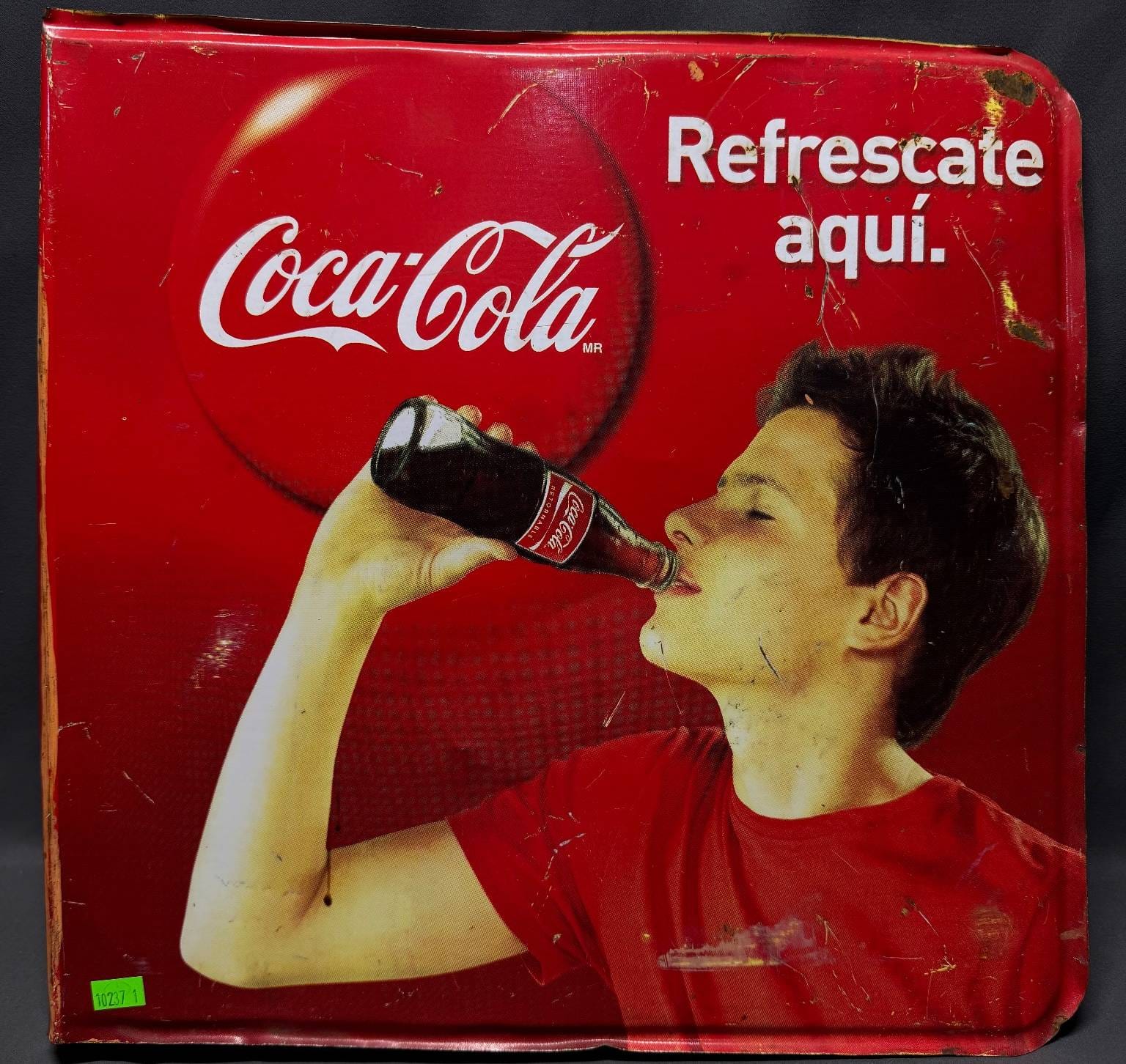 10237 Coca-Cola Flange Steel Spanish Advertising Sign, Refrescate Aqui Design, Marked Pino S727-76-56, 15.25”x15.25”x2.5”,