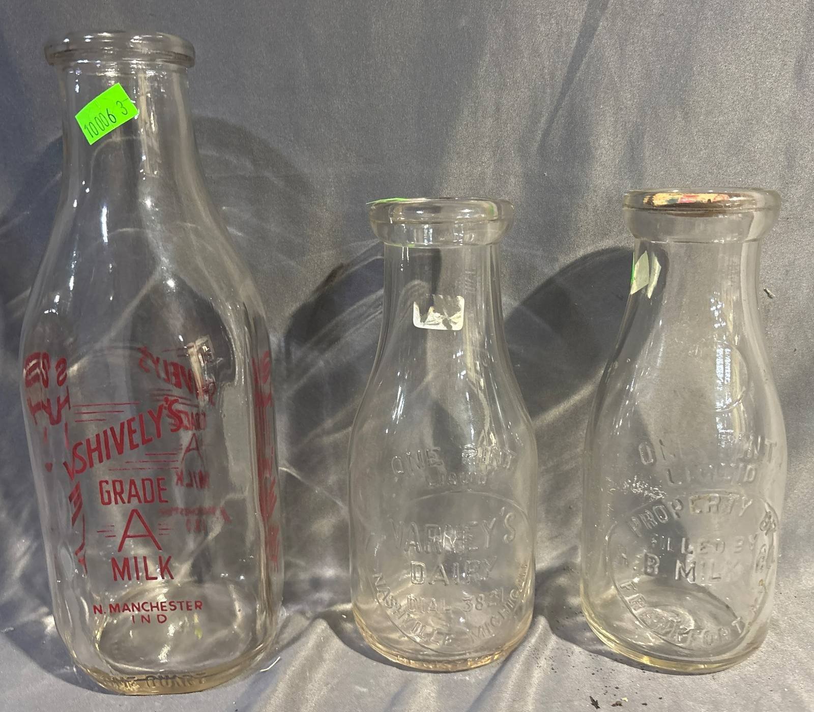 10006 3 Glass Milk Bottles: Shively’s, N. Manchester, Varney’s Dairy, and Moreland Cream