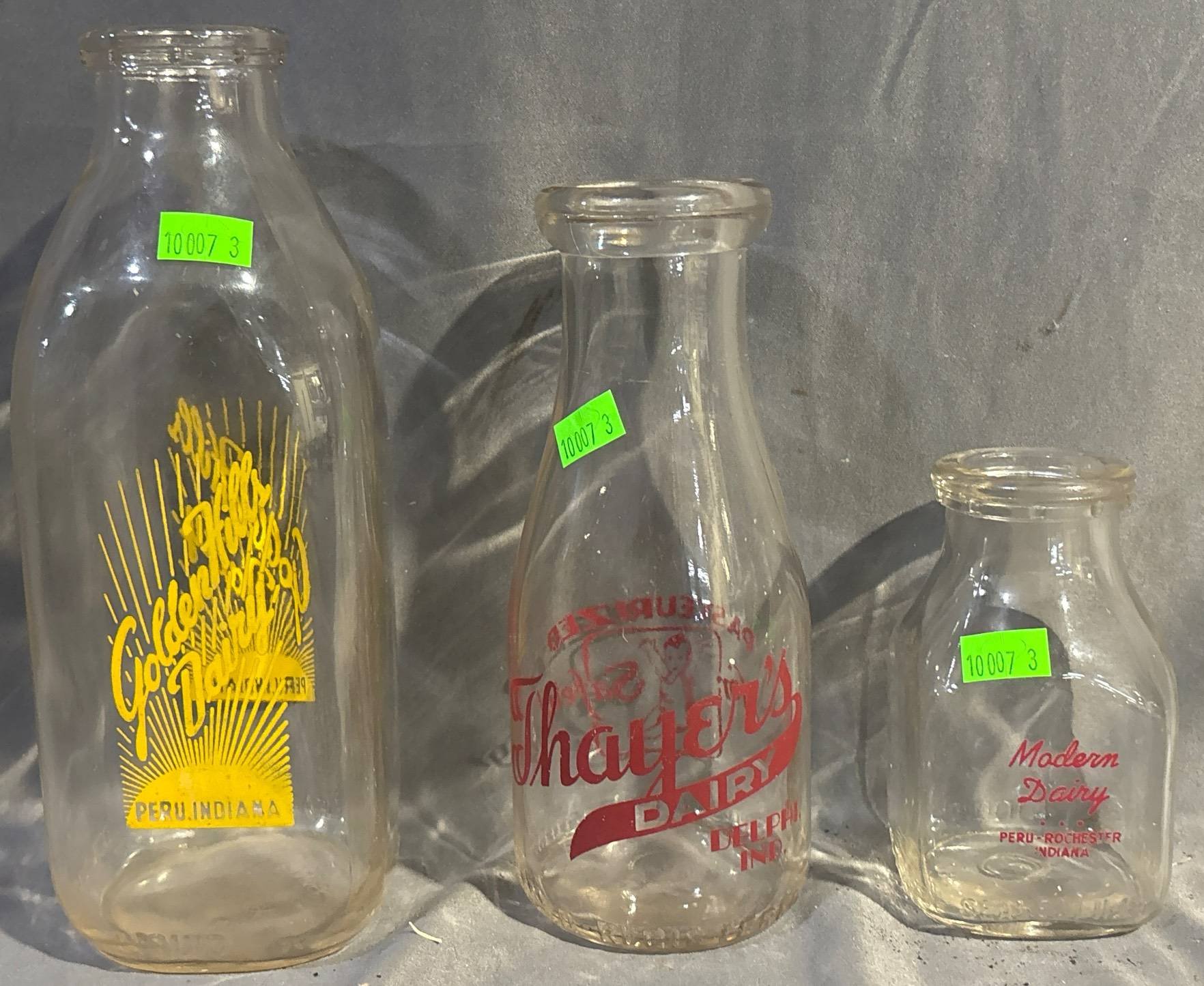 10007 3 Milk Bottles inc. Golden Hills Dairy Peru, Indiana, Thayer's Dairy & Modern Dairy Peru-Rochester, Indiana