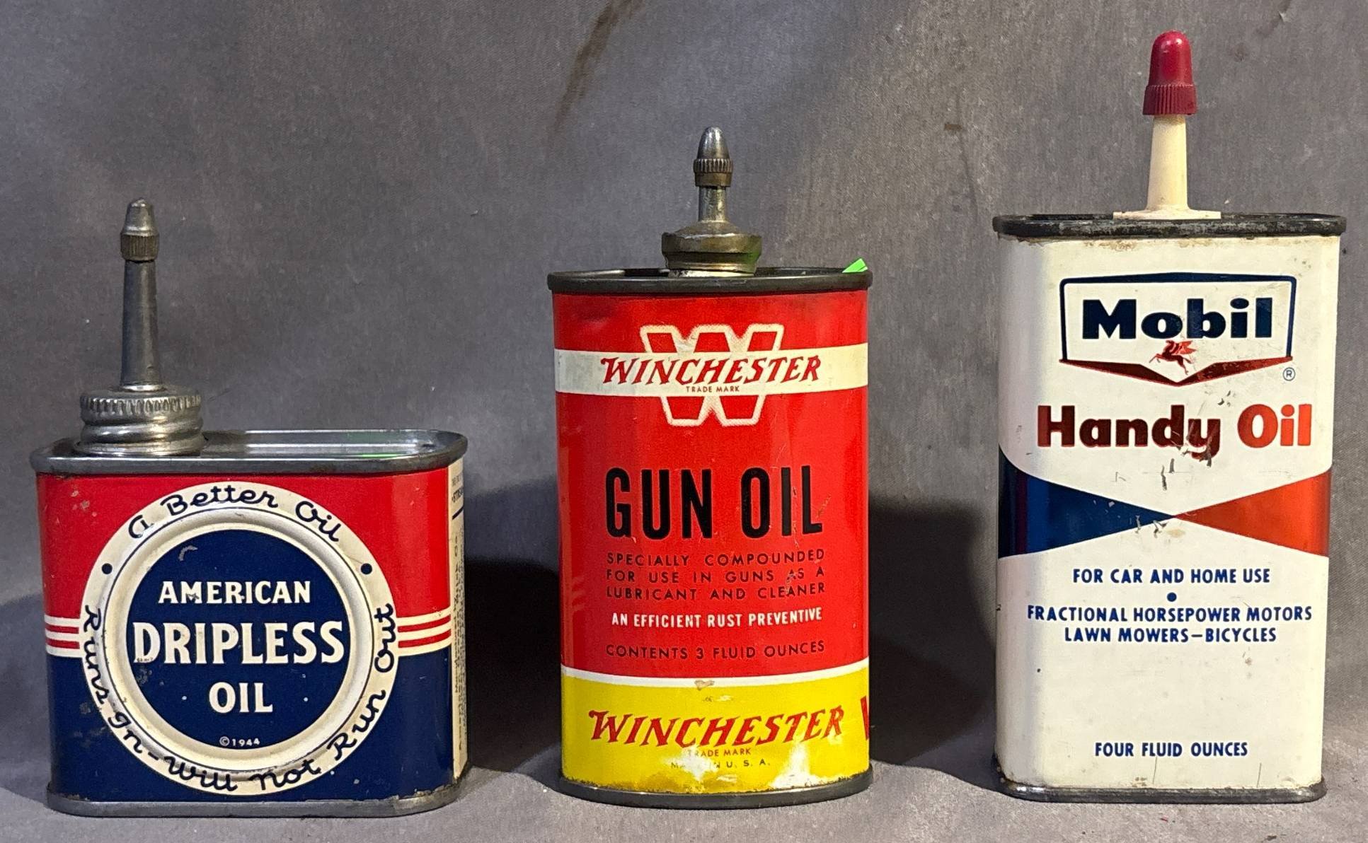 10029 3 Metal Oil Cans: Mobil Handy Oil, Winchester Gun Oil & American Dripless Oil