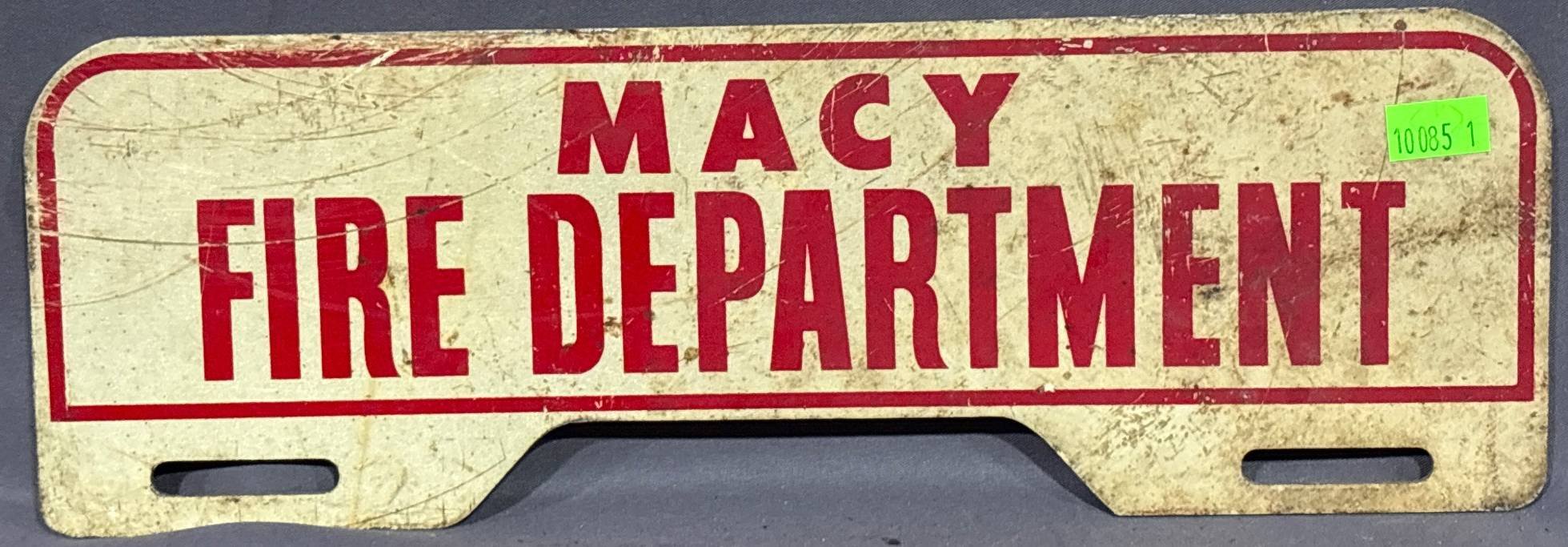 10085 Metal Sign with ‘Macy Fire Department’ in Red Text, 12?