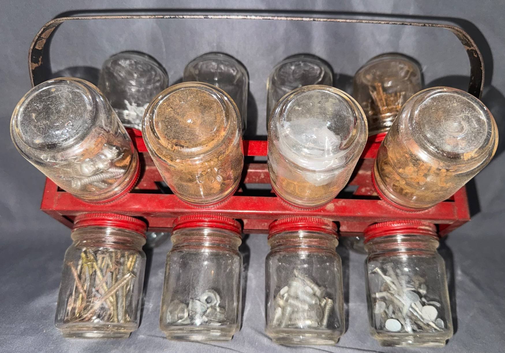 10202 Metal Hardware Rack with 8 Glass Jars Containing Assorted Fasteners 12”x5.5”