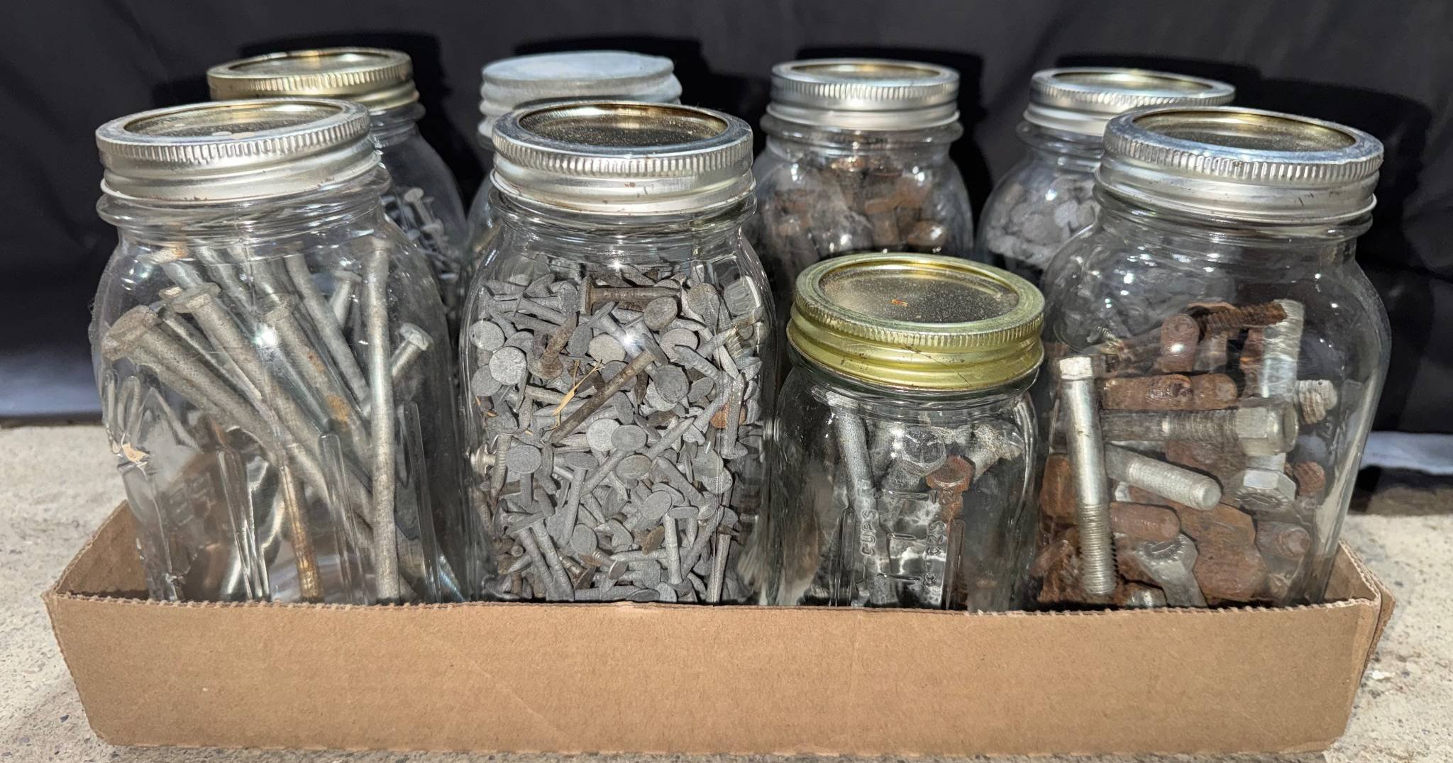 10203 (8) Glass Jars Containing Nails, Screws, and Bolts