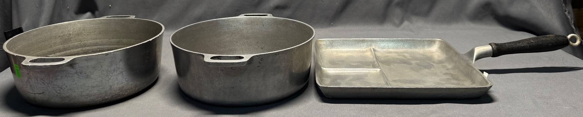 10228 Griswold Cast Aluminum Casseroles and Wagner Ware Divided Skillet, 8.5”x3”, 9”x9”x1”