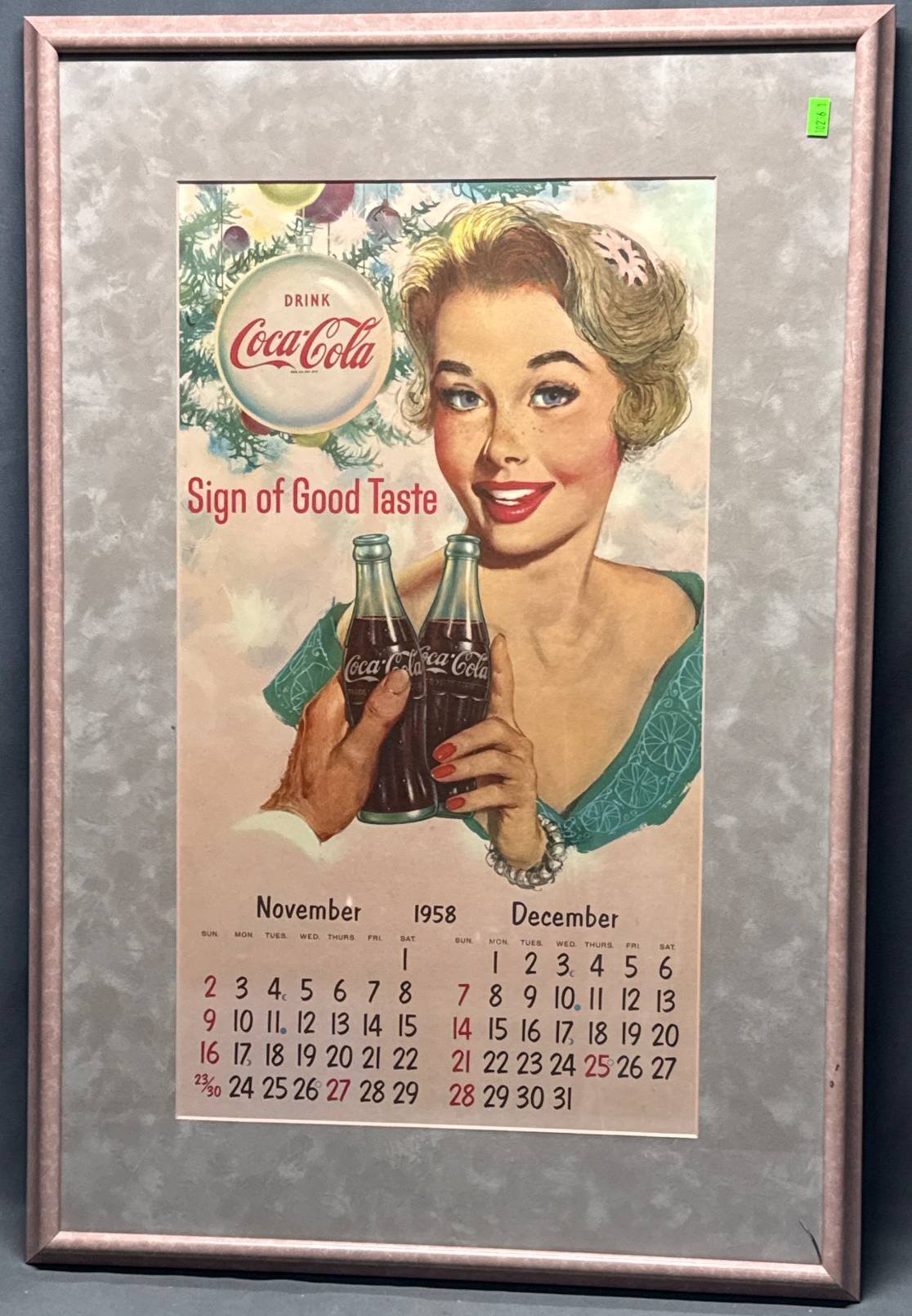 10236 Framed Drink Coca-Cola Calendar Print, November-December 1958, 19”x29”