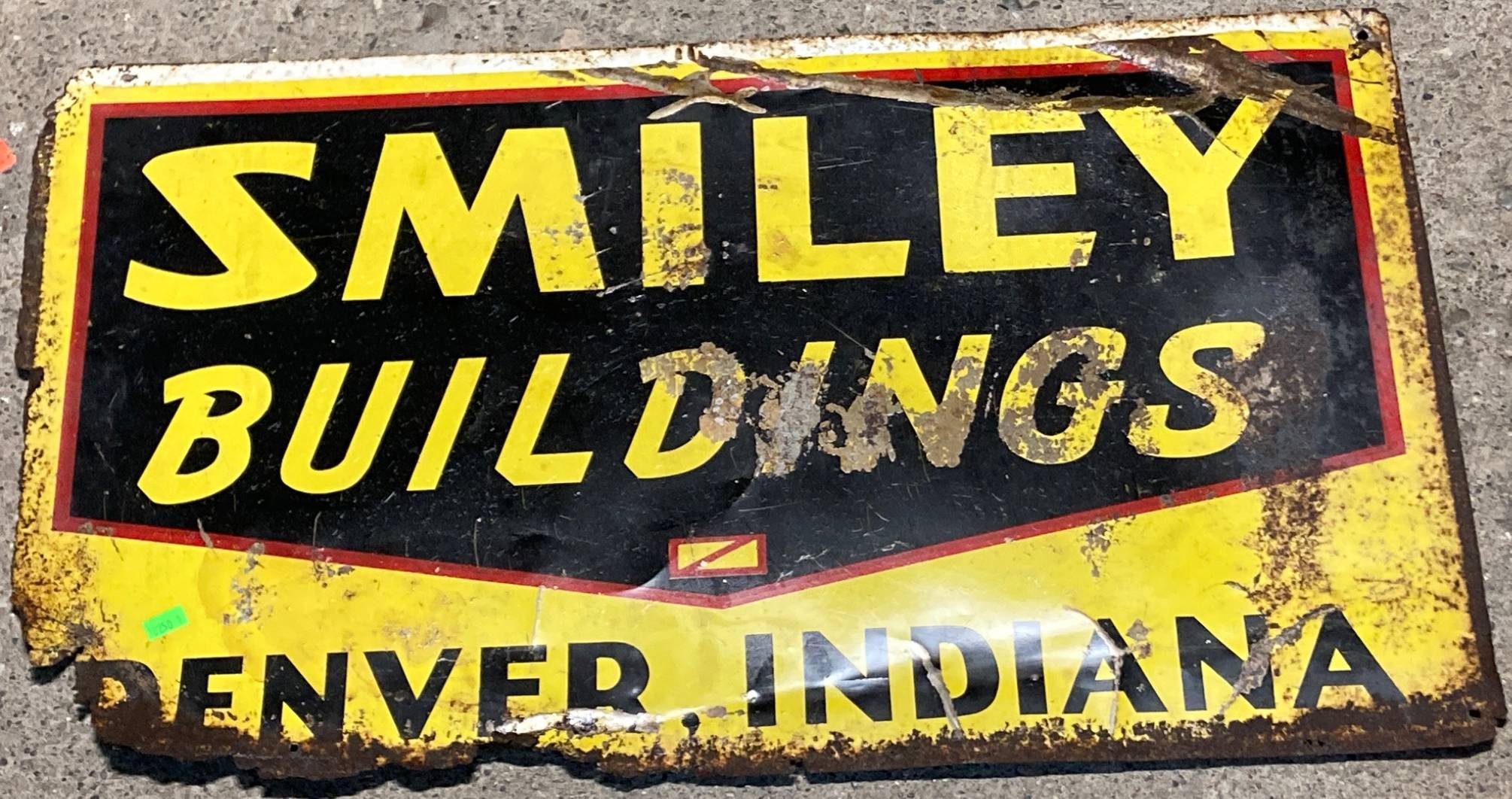 10250 Smiley Buildings Metal Advertising Sign, Denver, Indiana, (shows wear, rust) 28”x16”