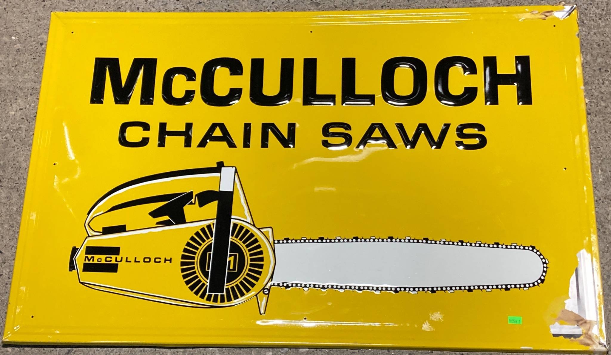 10256 McCulloch Chain Saws Yellow Enamel Advertising Sign, 34”x22.25”