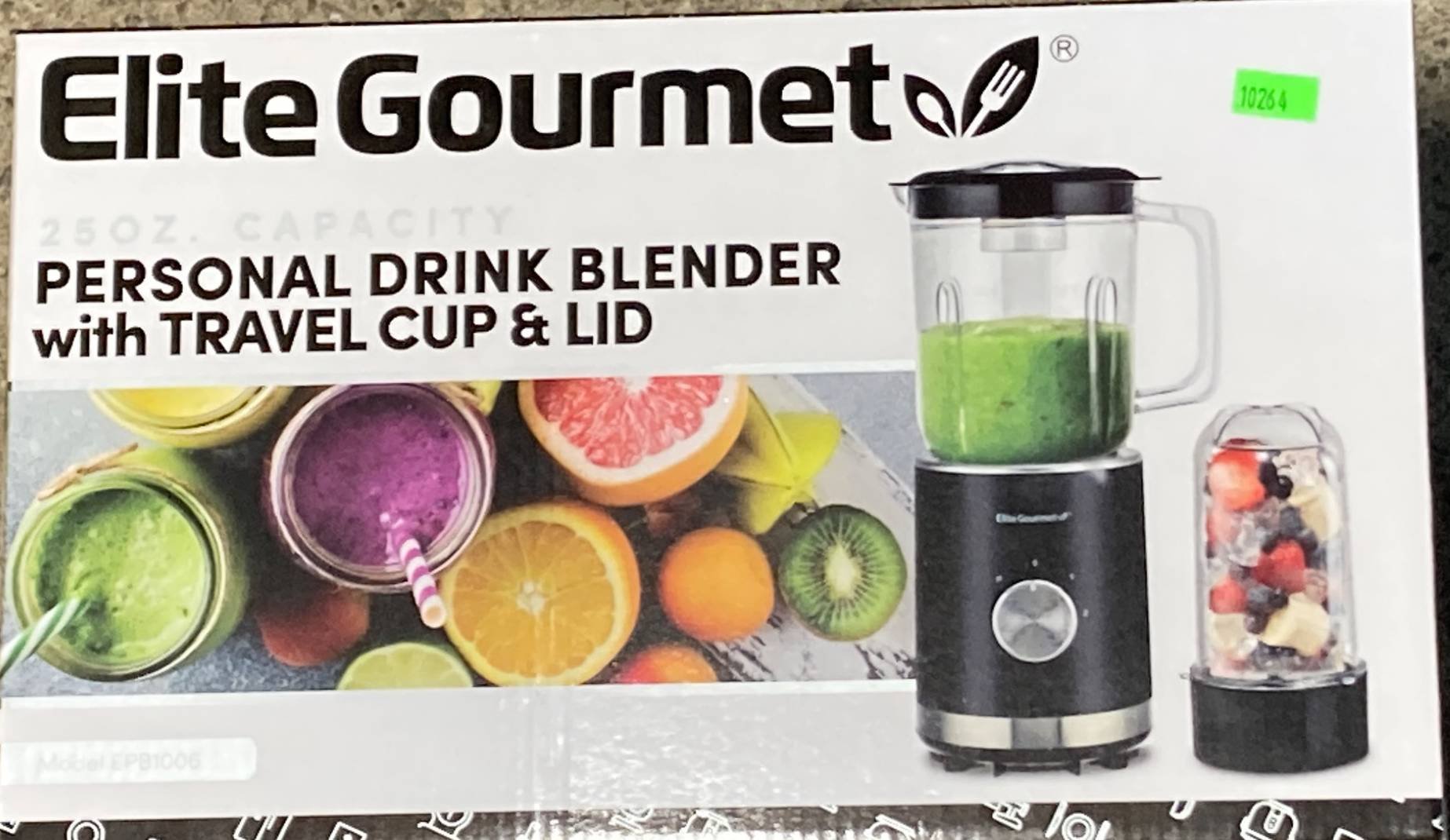 10264 Elite Gourmet 25 Oz Personal Drink Blender with Travel Cup & Lid, 13.25”,5.5”x8.25”