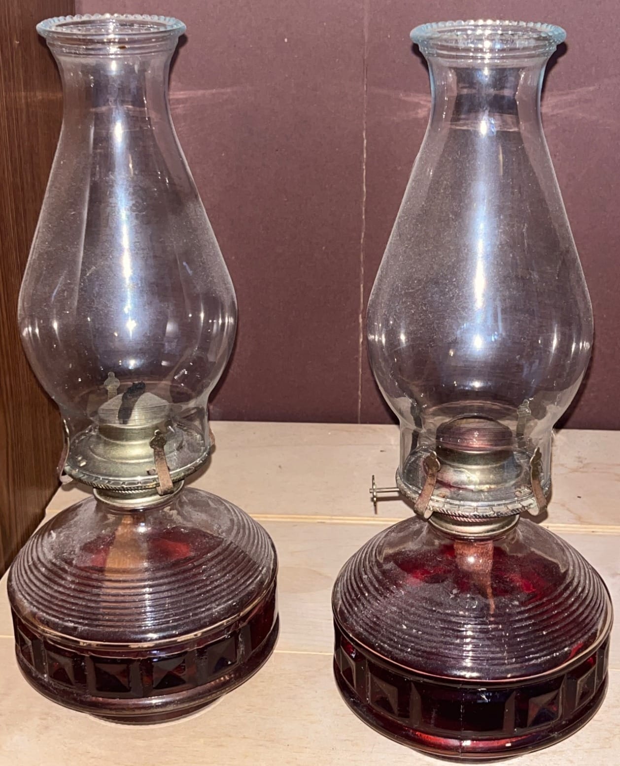 103 2 Lamplight Farms Glass Oil Lamps with Red Textured Bases, 14” Tall