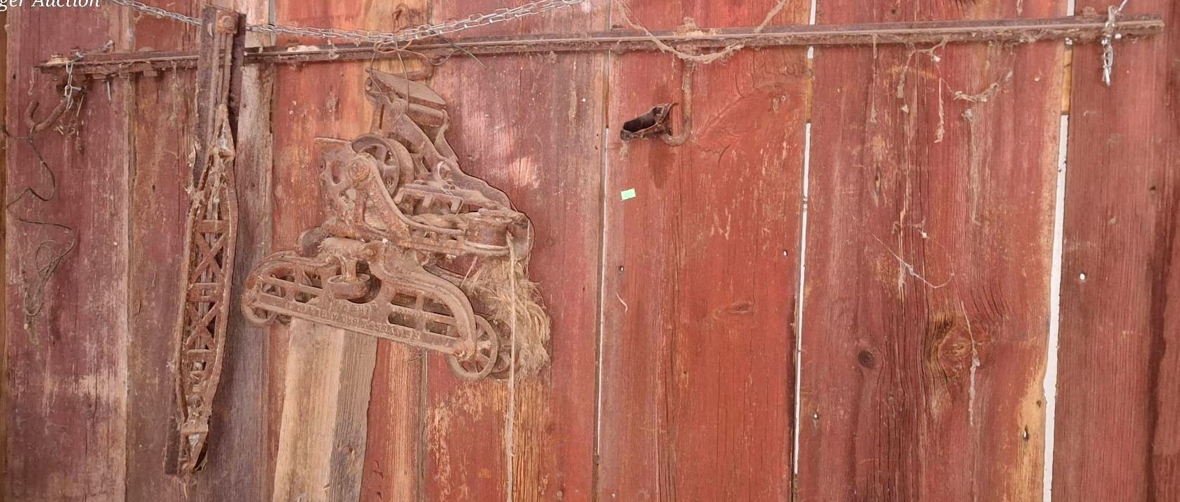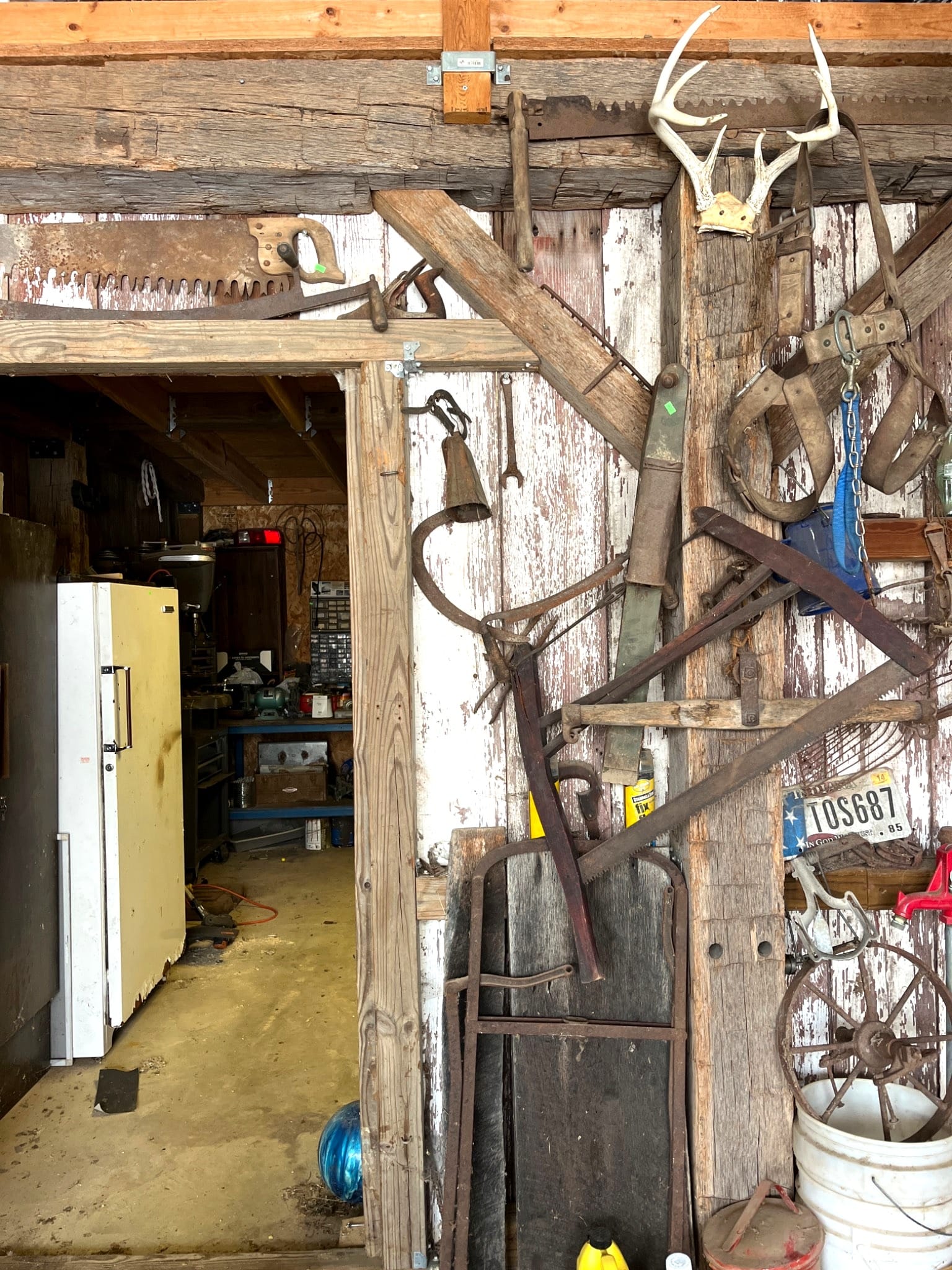 1051 Rustic Farm Tools and Implements with Antler Mount Inc. Crosscut Saw, Pulley and More