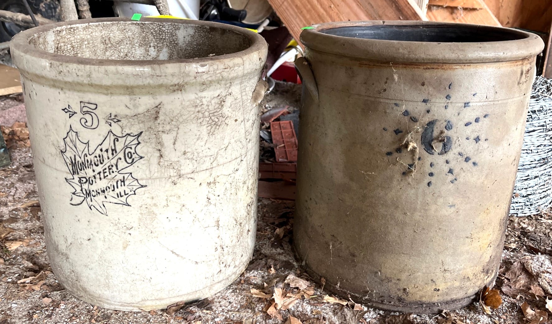 1055 Stoneware Crocks by Monmouth Pottery Co., 5-Gallon and 6-Gallon (cracks)