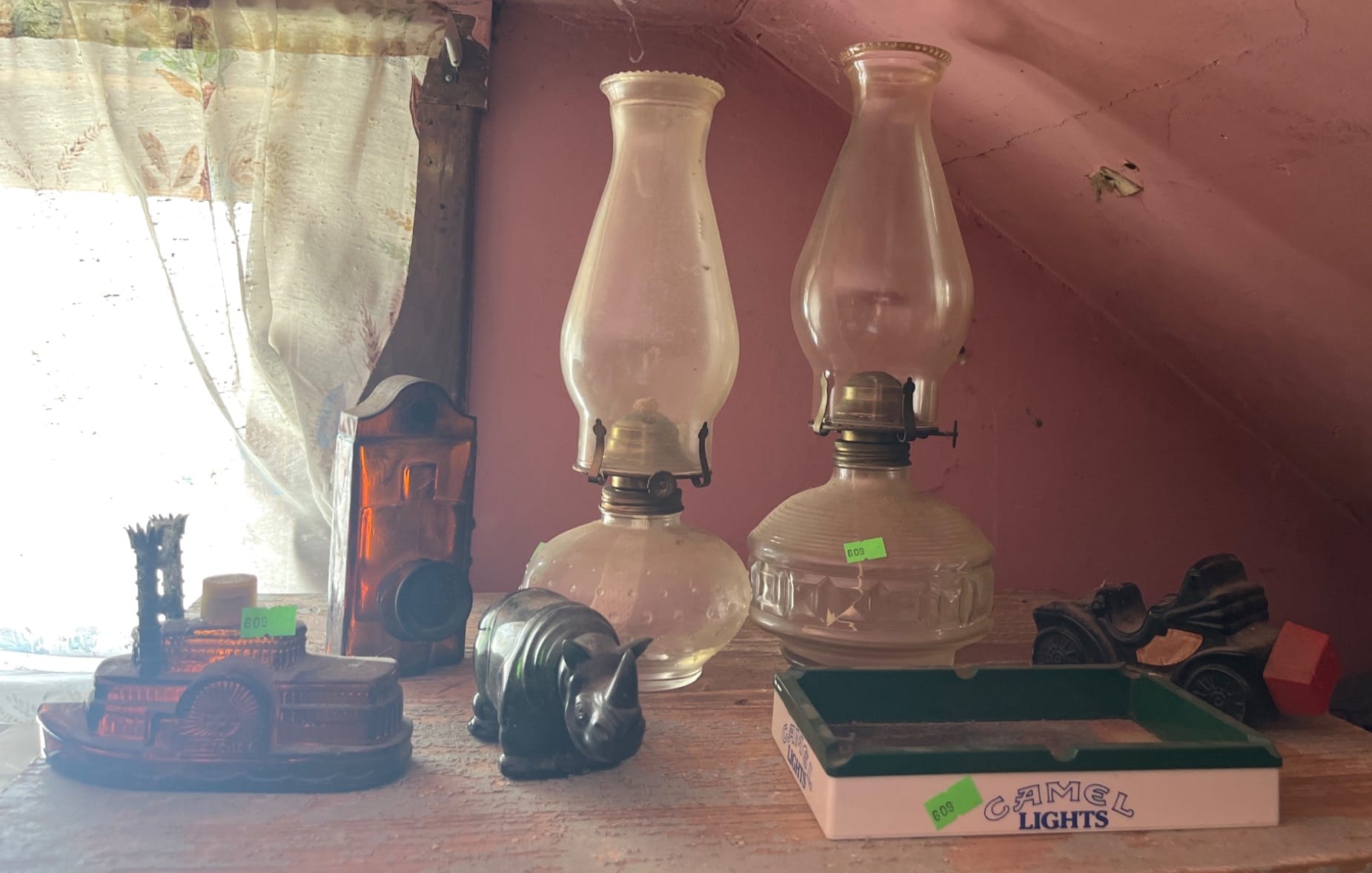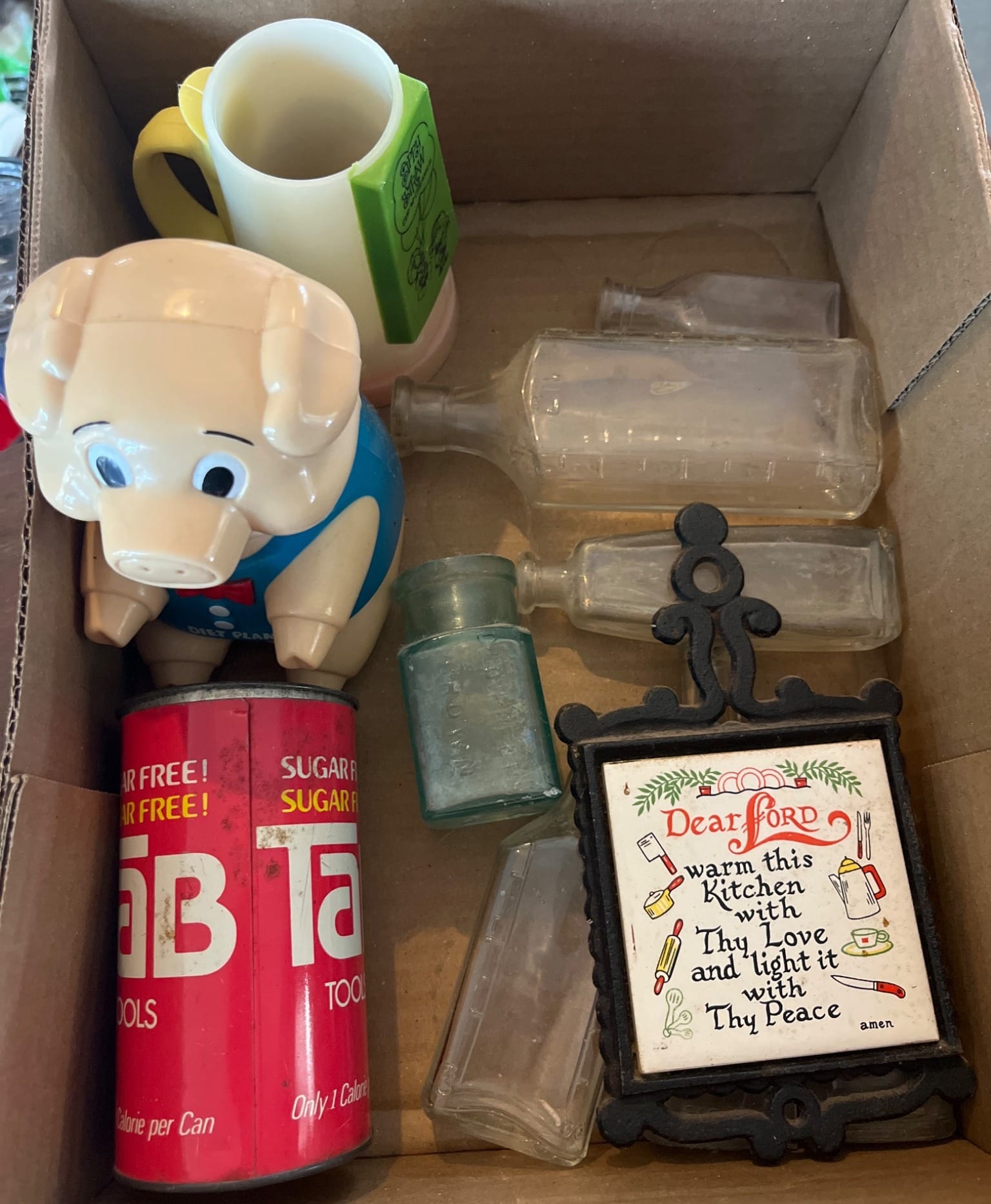 109 Household Decorative Items Including Tab Can, Piggy Bank, and Glass Bottles