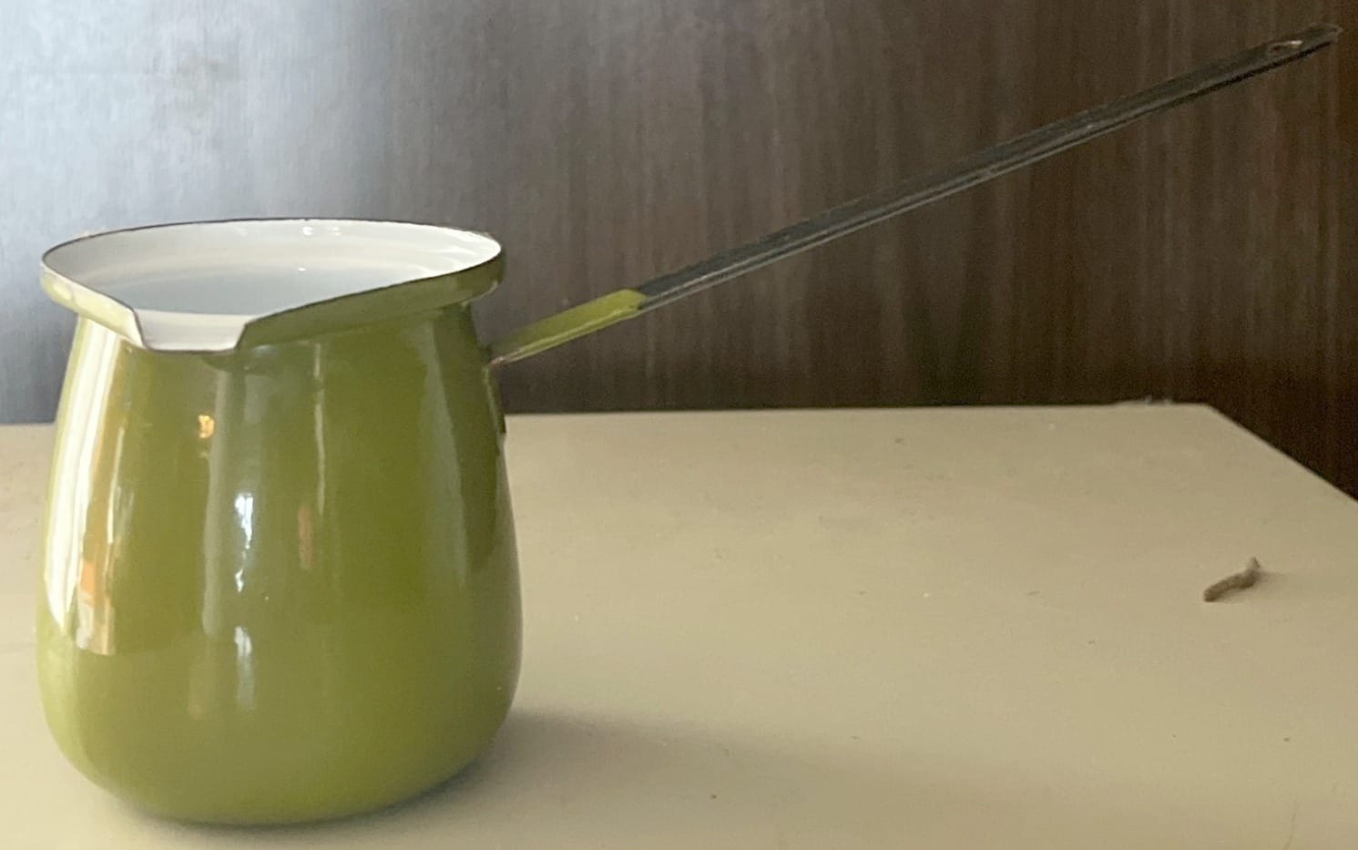 124 Green Enamel Saucepot With Black Handle, 7? Long