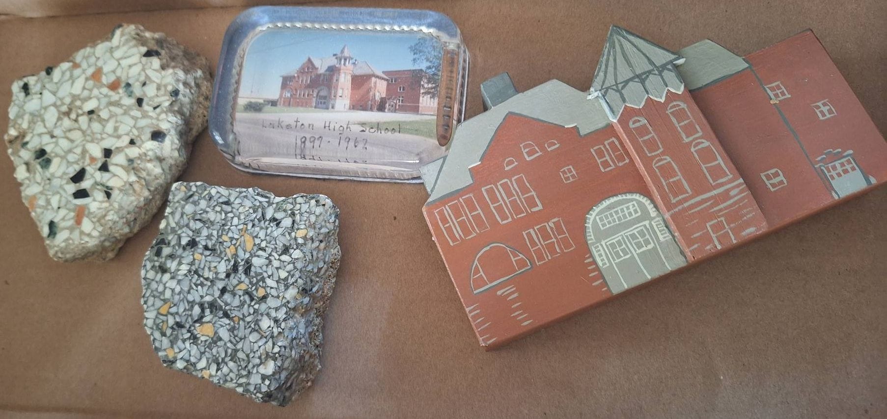 128 Laketon School Memorabilia: 2 Floor Pieces, Paperweight and Wood Cut-Out