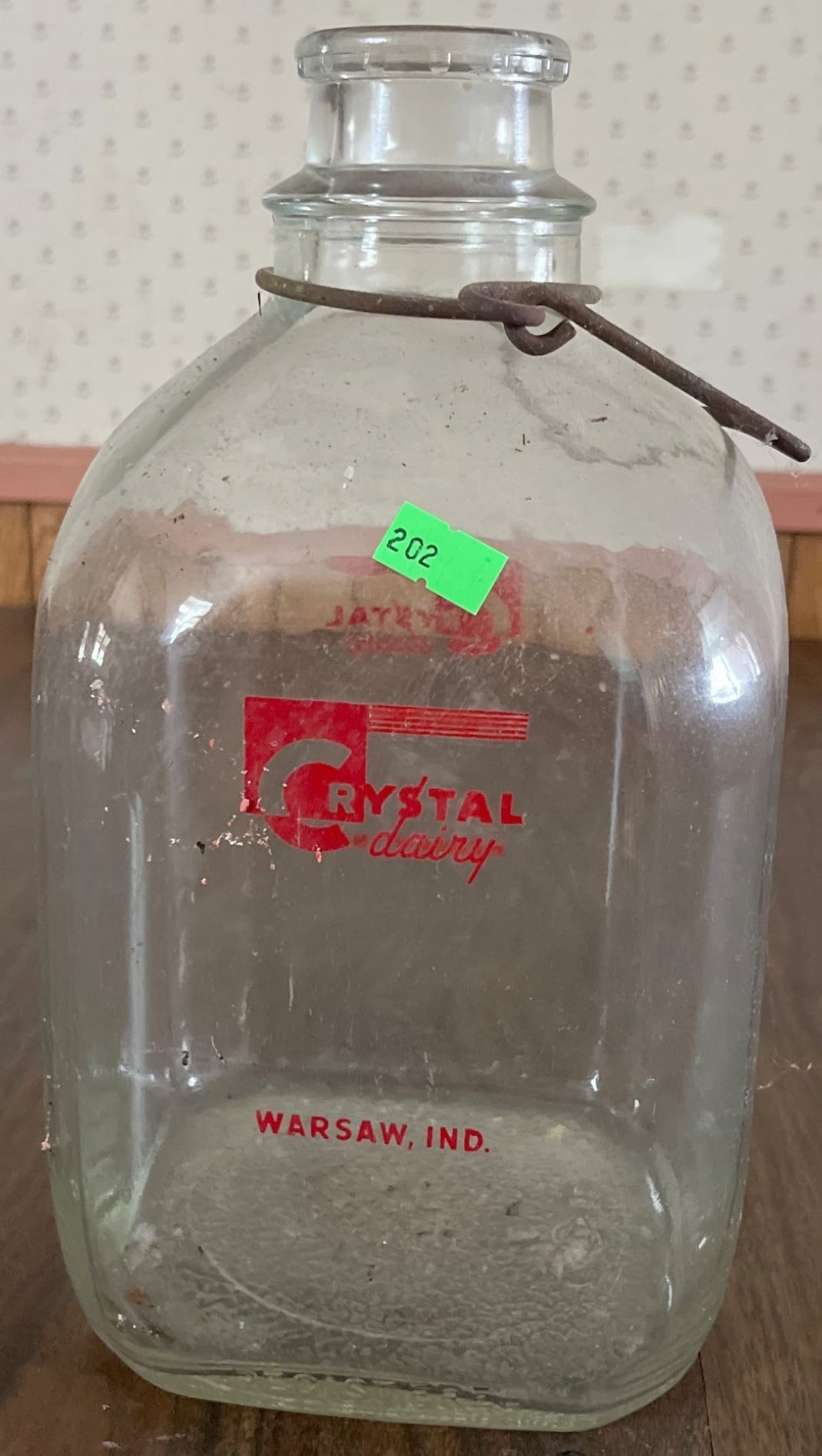 202 Clear Glass Milk Bottle with Red ‘Crystal Dairy’ Logo, Warsaw, IN, 1 Gal