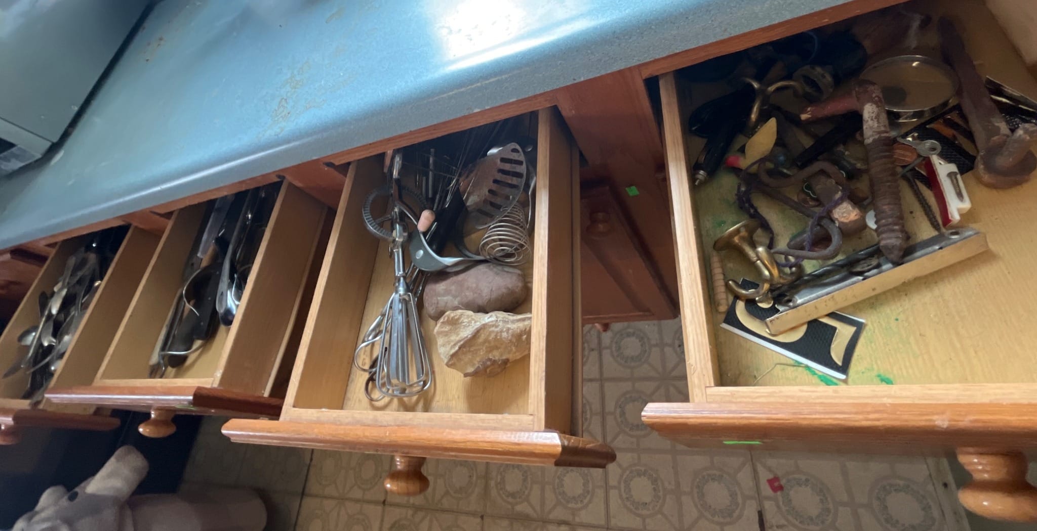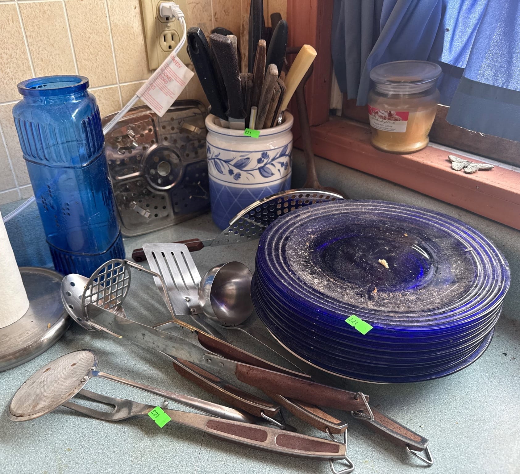 221 Kitchen Utensils and Blue Glass Plates