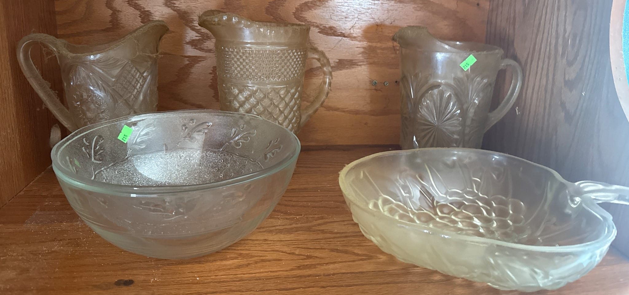 215 3 Pressed Glass Pitchers, Bowl, And Leaf-Shaped Dish
