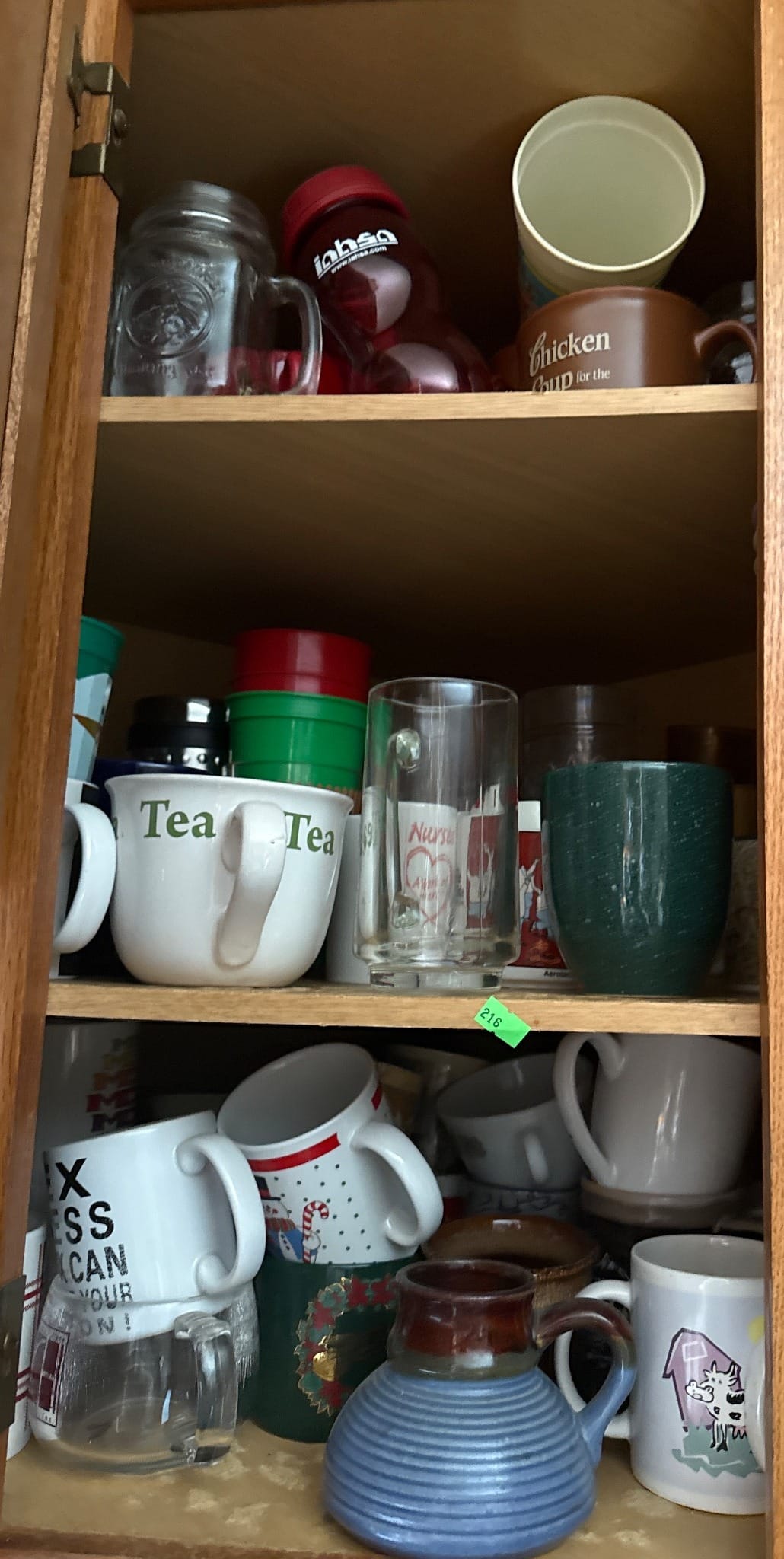 216 Ceramic, Glass, and Plastic Drinkware, shelves not included