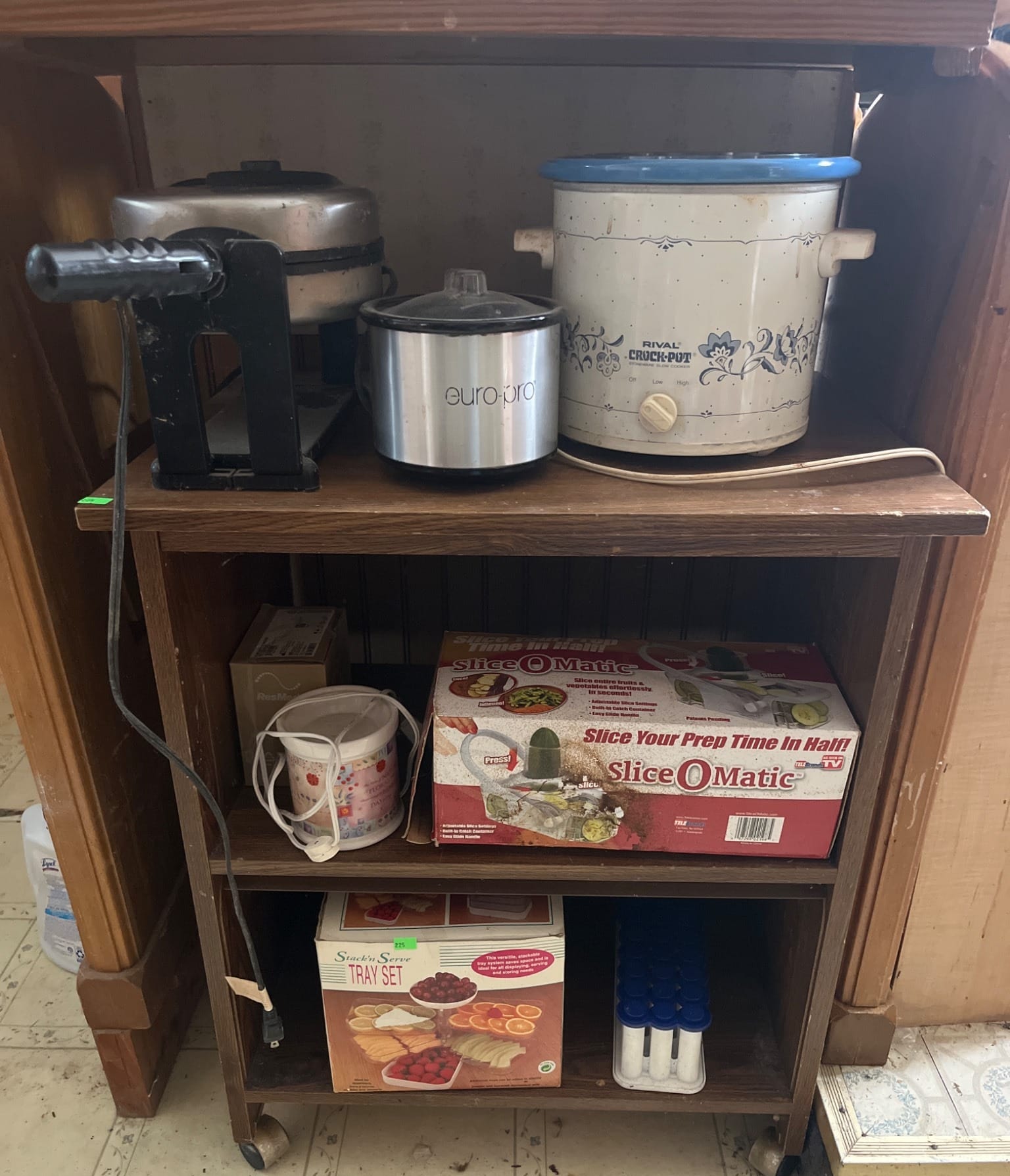 225 Rolling Cart Including Crock-Pot, Waffle Maker, and Kitchen Accessories, Untested, 24.75? x 49.25? x 30.25?