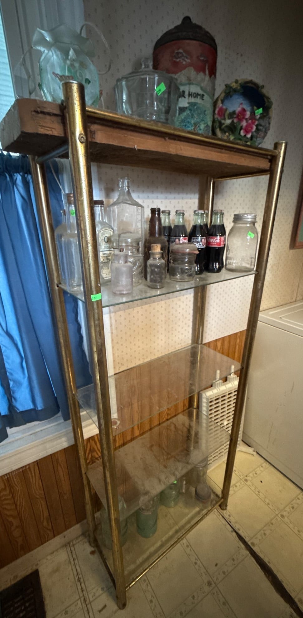 232 Metal and Glass Shelf Stand with Brass Finish, 63? x 11? x 25?. Contents Not Included