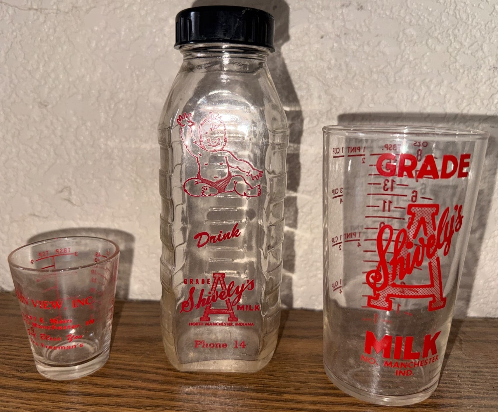 307 Shiveley’s Milk Bottle & Measurer with Main View Shot Glass, N. Manchester, IN - 1 Pt, 3 Cups
