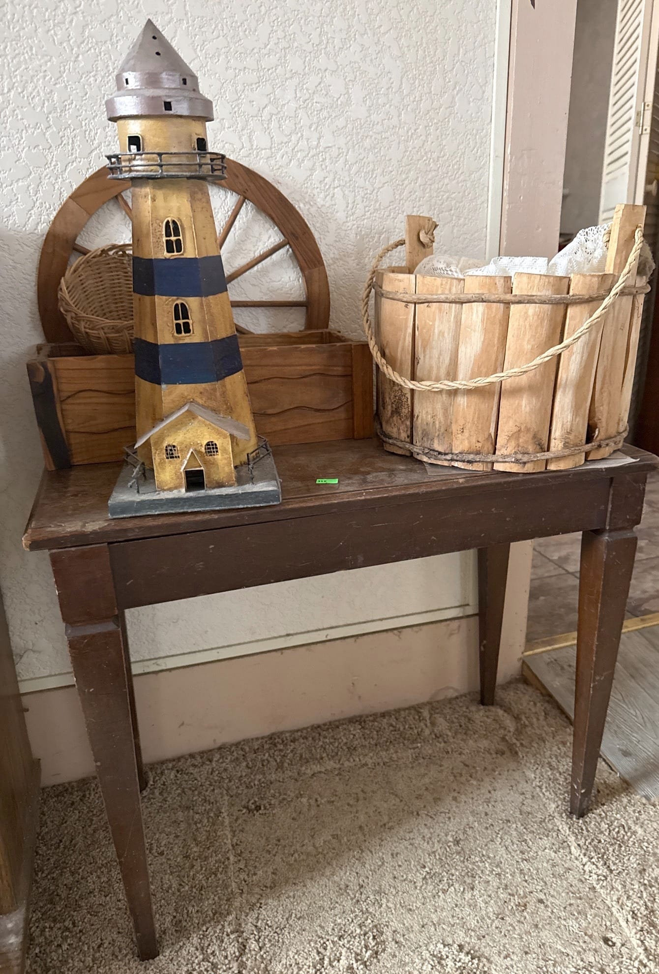 312 Bench with Lighthouse Decoration, Wooden Pail, and Wheel Accent Decor 13.5? x 24? x 20?