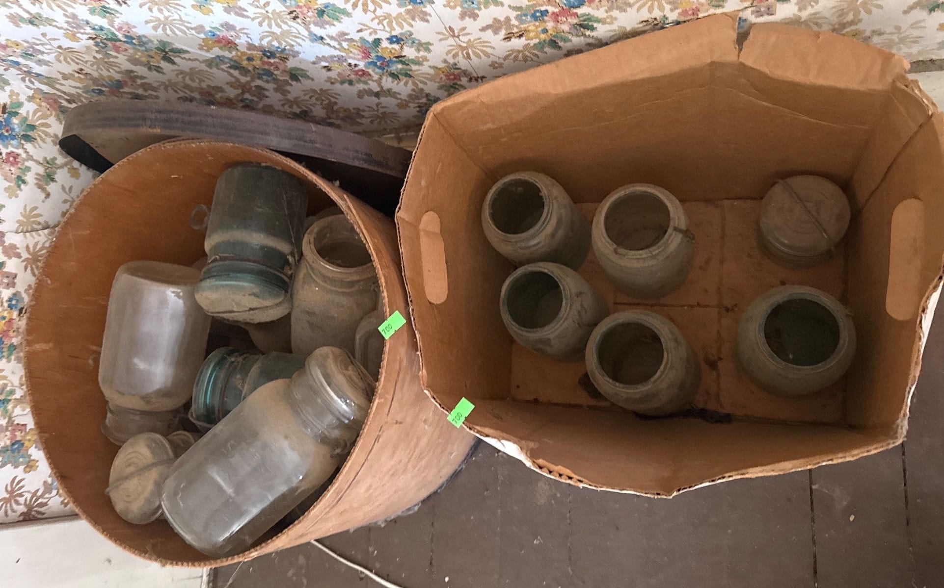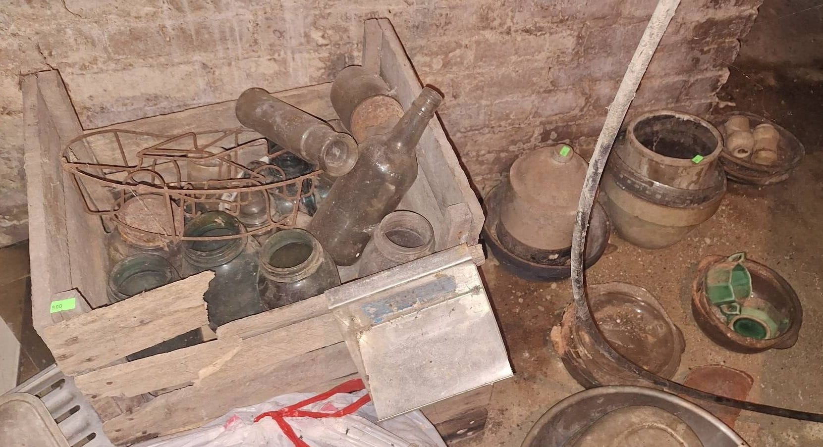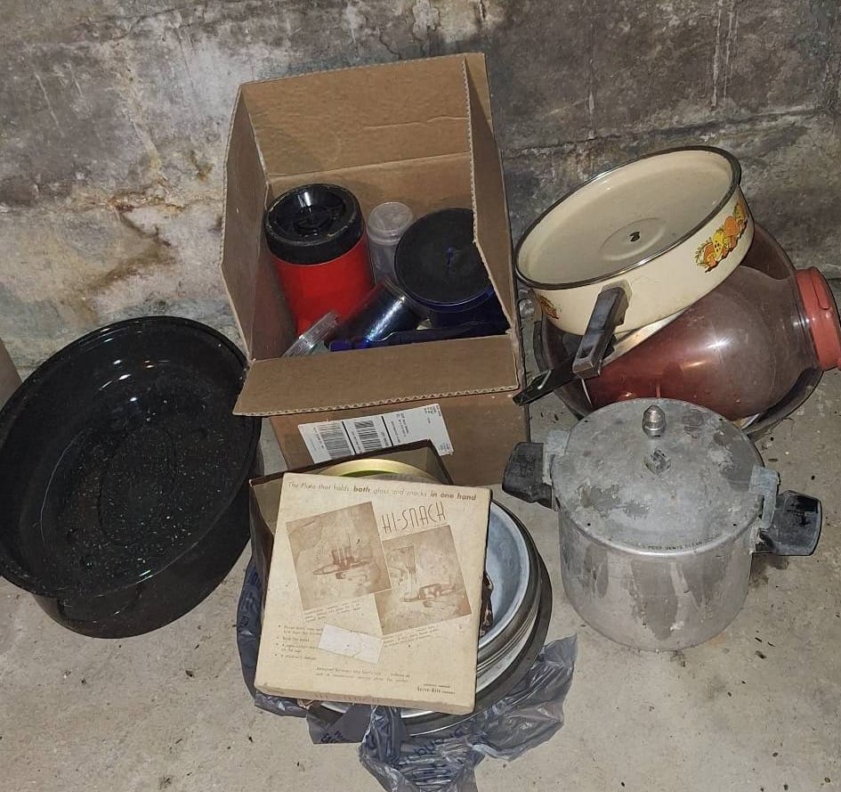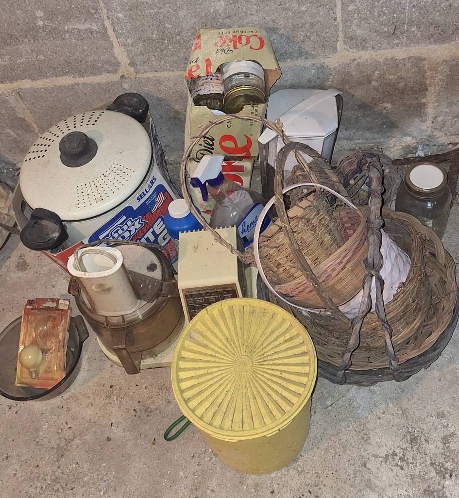 900 Crock Chicken Waterer, Crock Bowl (cracked), Glass Jars, Metal Containers, and Kitchenware Items