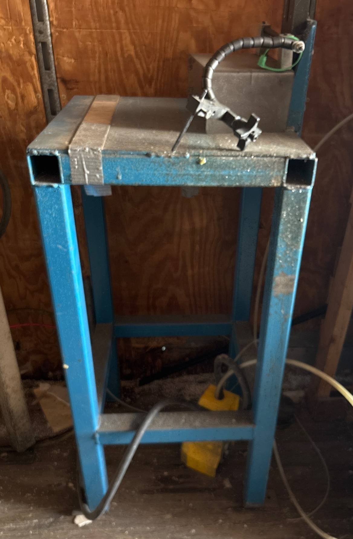 6538 Blue Metal Workbench with Mounted V-Block Fixture and Flexible Coolant Hose - Unknown Condition - PICK UP ALTERNATE LOCATION NAPPANEE INDIANA