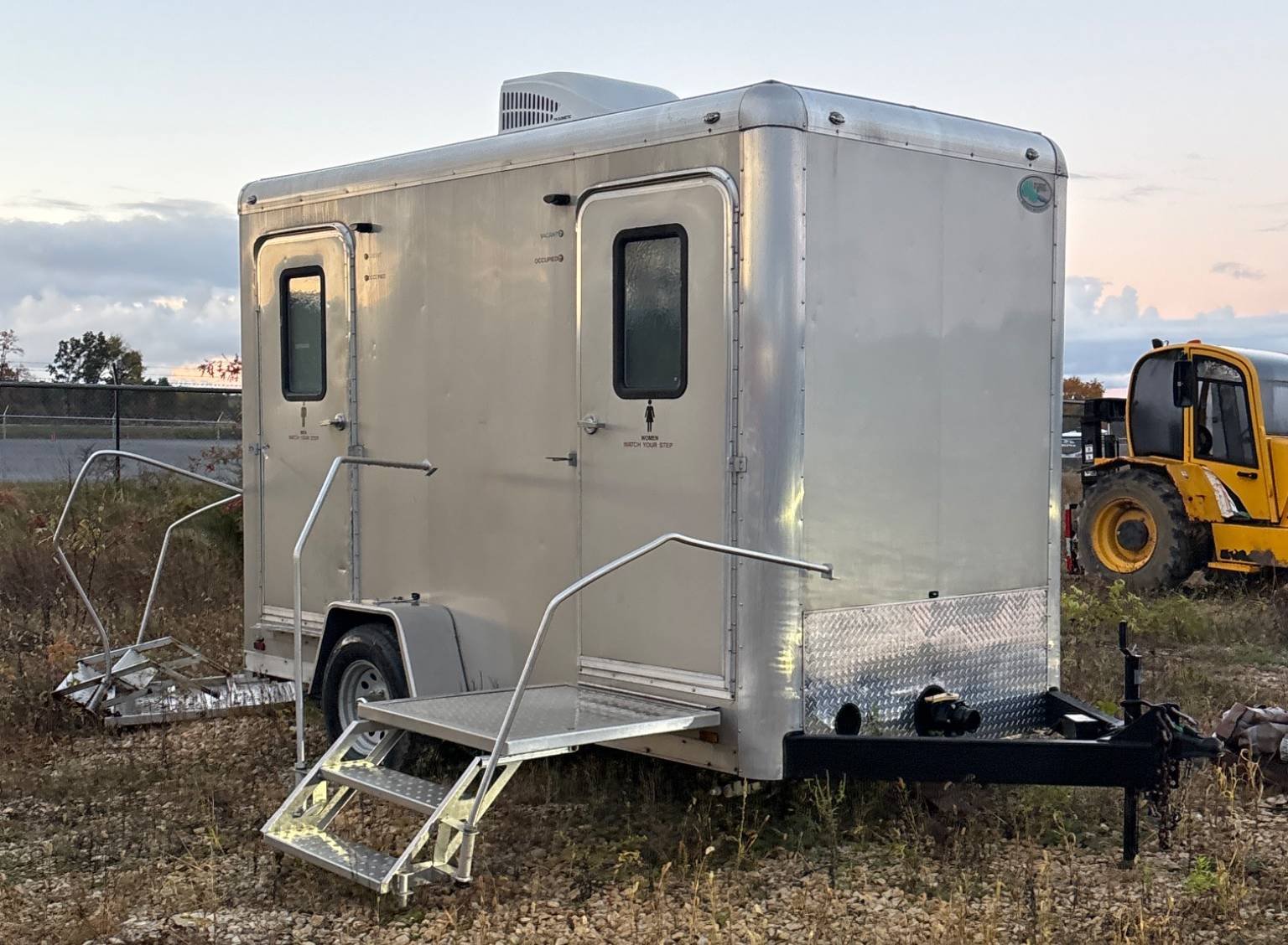 6880 Forest River Inc. restroom trailer with a single axle, 2 doors, 2 steps, and a 2-5/16? coupler. Includes toilet, urinal, sink, electrical panel, air conditioning, and plumbing system. (Unit not tested, platform ripped off. Rough Condition, Appears to Have Been Frozen, Unknown if Operational. (NO TITLE ) PICK UP AT ALTERNATE LOCATION MIDDLEBURY INDIANA-28