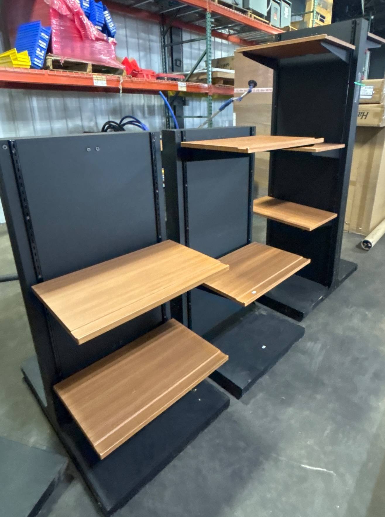 6910 Black Metal Retail Display Shelves with Adjustable Wood-Look Platforms
