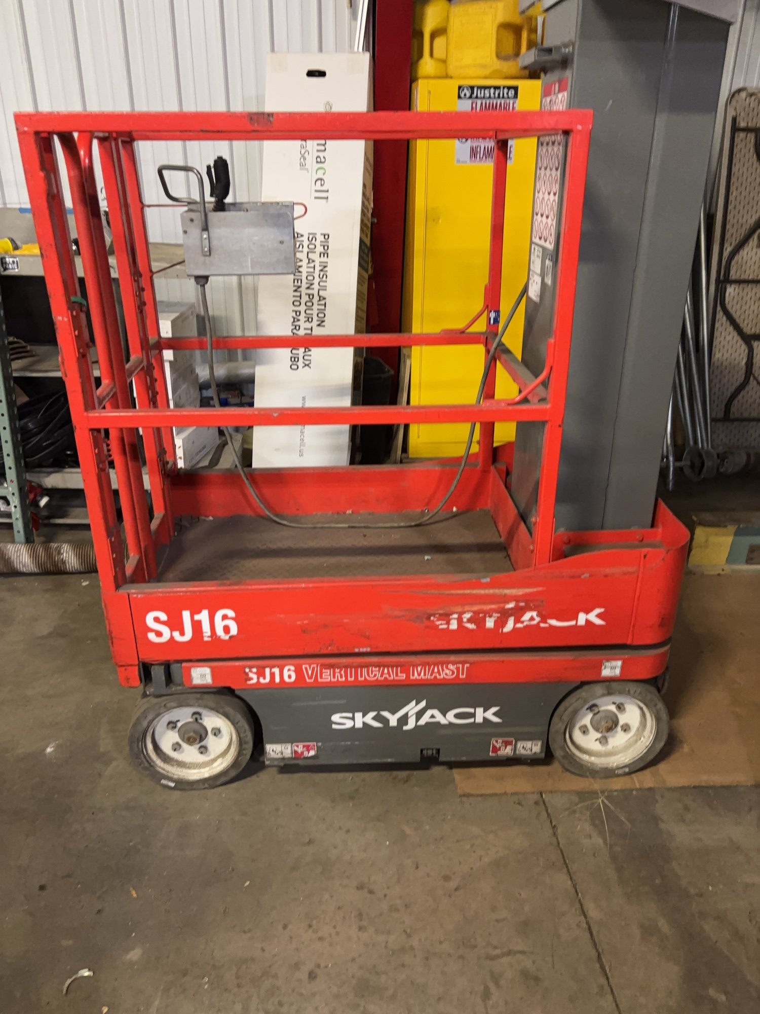 6932 SkyJack SJ16 Vertical Mast Lift, 31" Wide, 15' Platform Height, 500 lb. Capacity, Solid Tires, Worked Forward, Backwards, Up and Down When Tested, NO OTHER INSPECTIONS PERFORMED- PICK UP ALTERNATE LOCATION ELKHART, INDIANA -JW