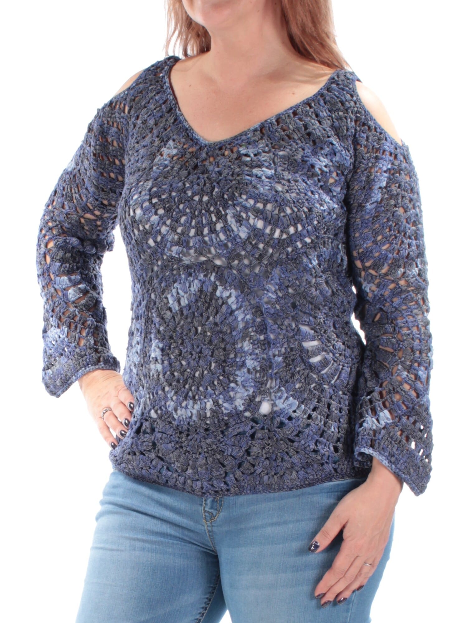 10078278 INC $99.50 MSRP Womens Blue Eyelet Sheer Bell Sleeve V Neck Top Size: S