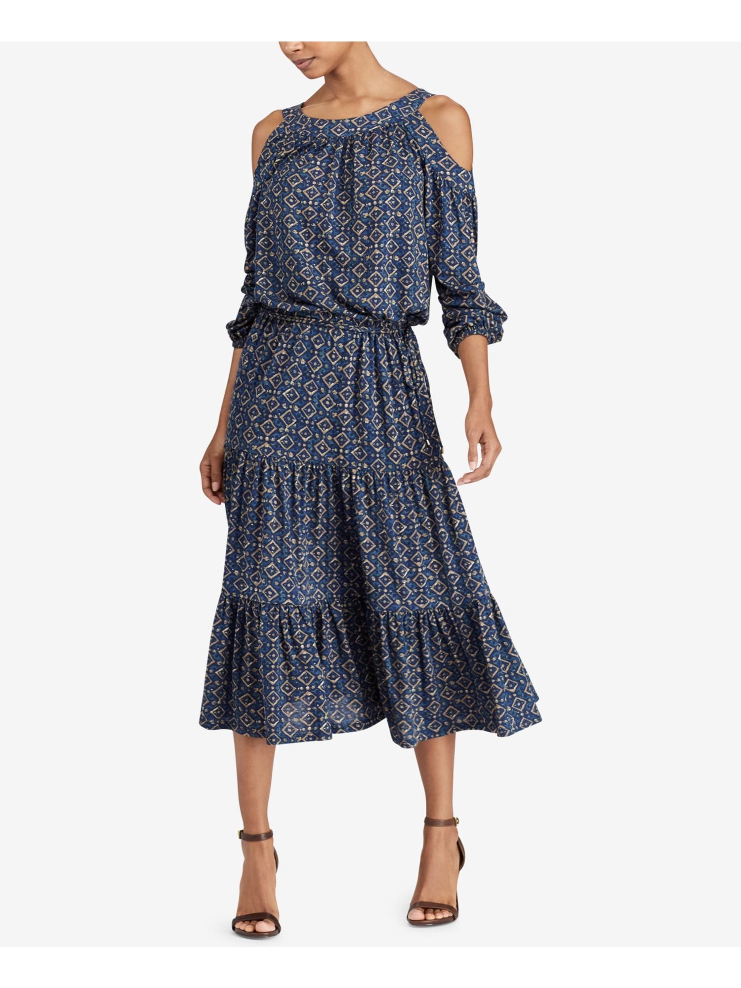 10088902 RALPH LAUREN $135 MSRP Womens Blue Long Sleeve Jewel Neck Tea Length Blouson Dress XXL