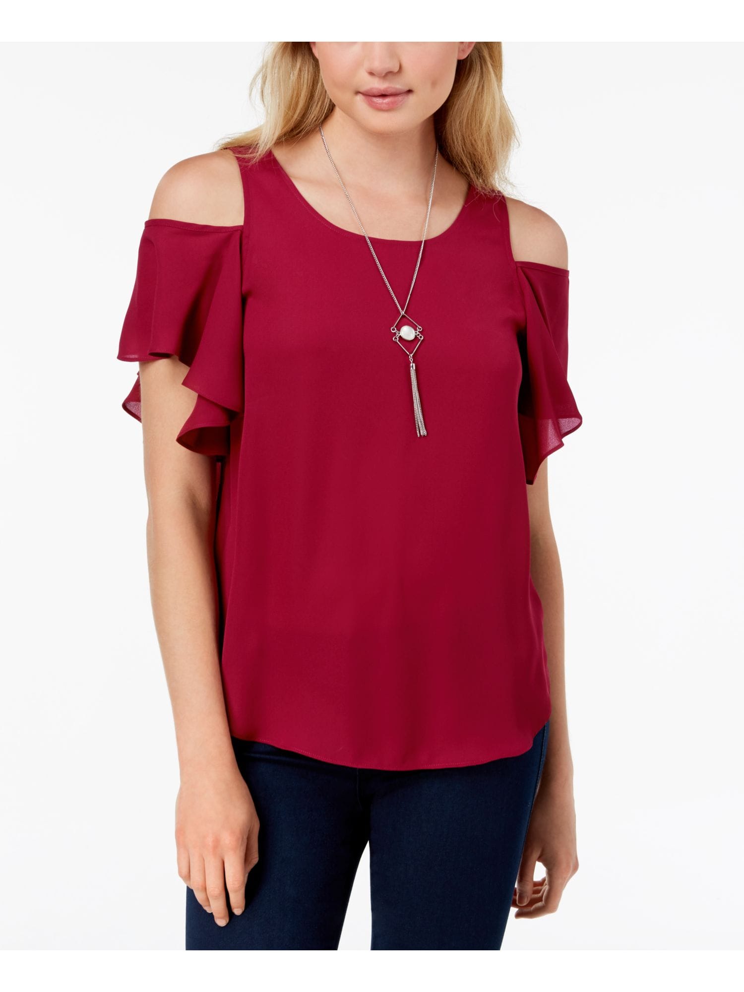 10127898 BCX $39 MSRP Womens Burgundy Ruffled Cold Shoulder Necklace Short Sleeve Jewel Neck Top XXS