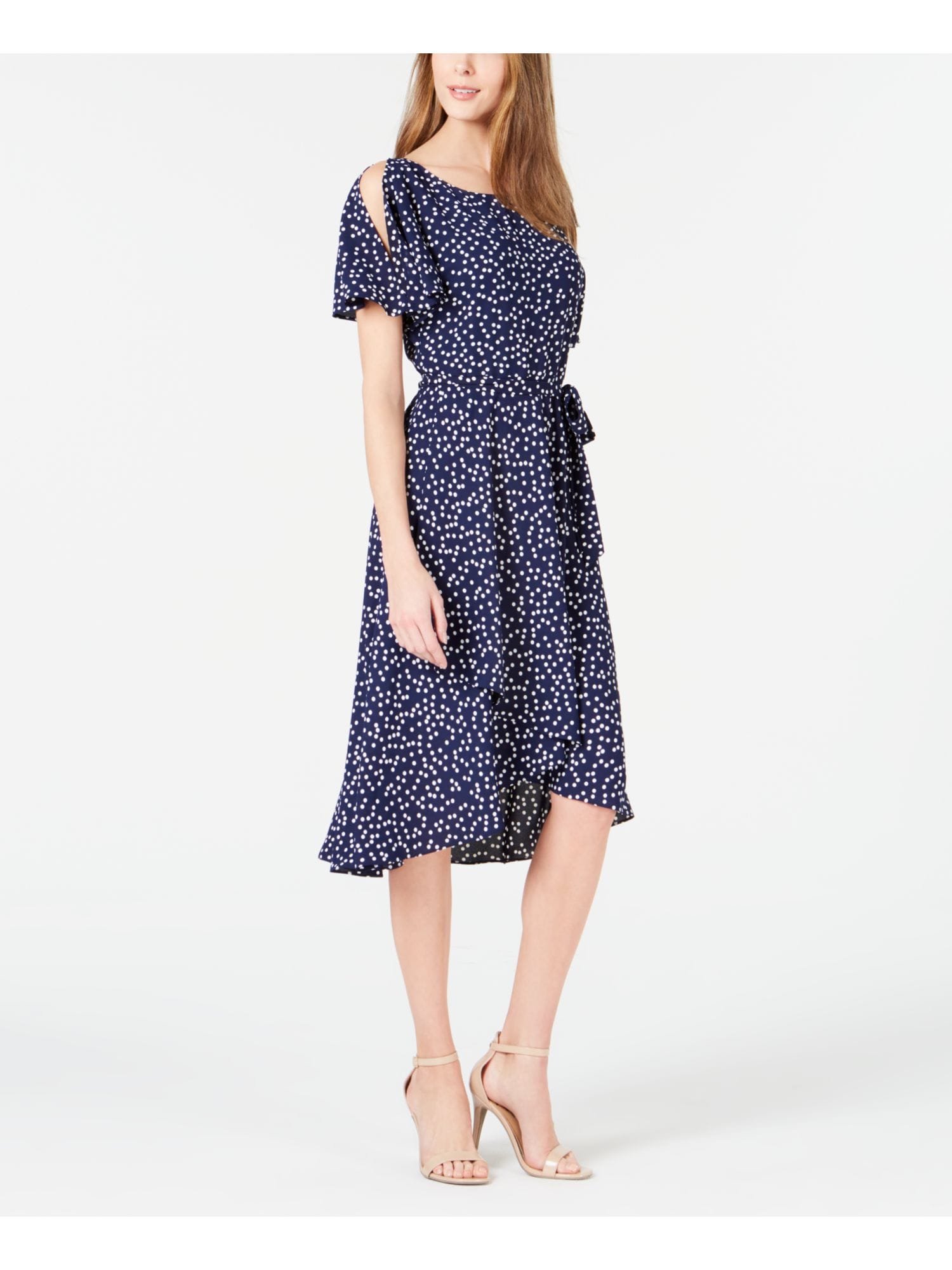 10149930 ANNE KLEIN $139 MSRP Womens Navy Ruffled Polka Dot Short Sleeve Jewel Neck Midi Cocktail Sheath Dress 2