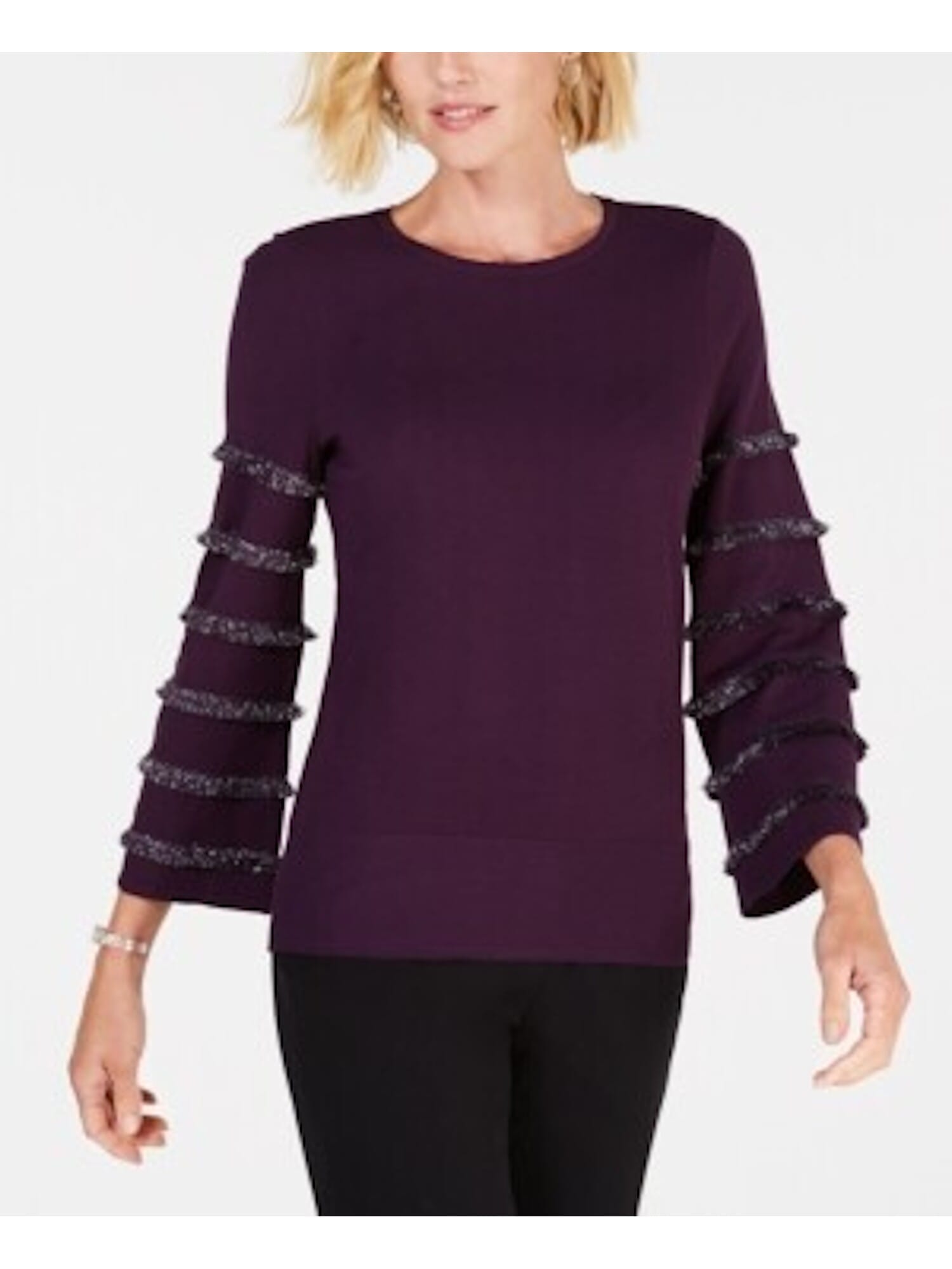 10150085 ALFANI $69.50 MSRP Womens Purple Fringed Tiered Fringe Long Sleeve Crew Neck T-Shirt L