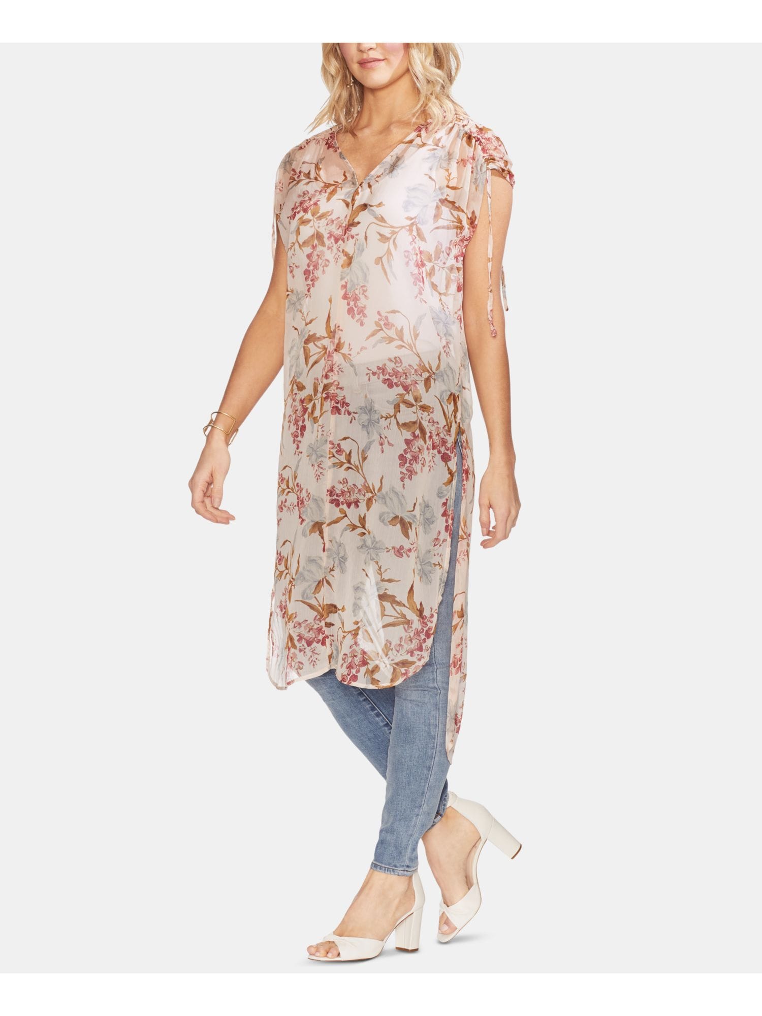 10152252 VINCE CAMUTO $99 MSRP Womens Beige Floral Cap Sleeve Jewel Neck Top XS