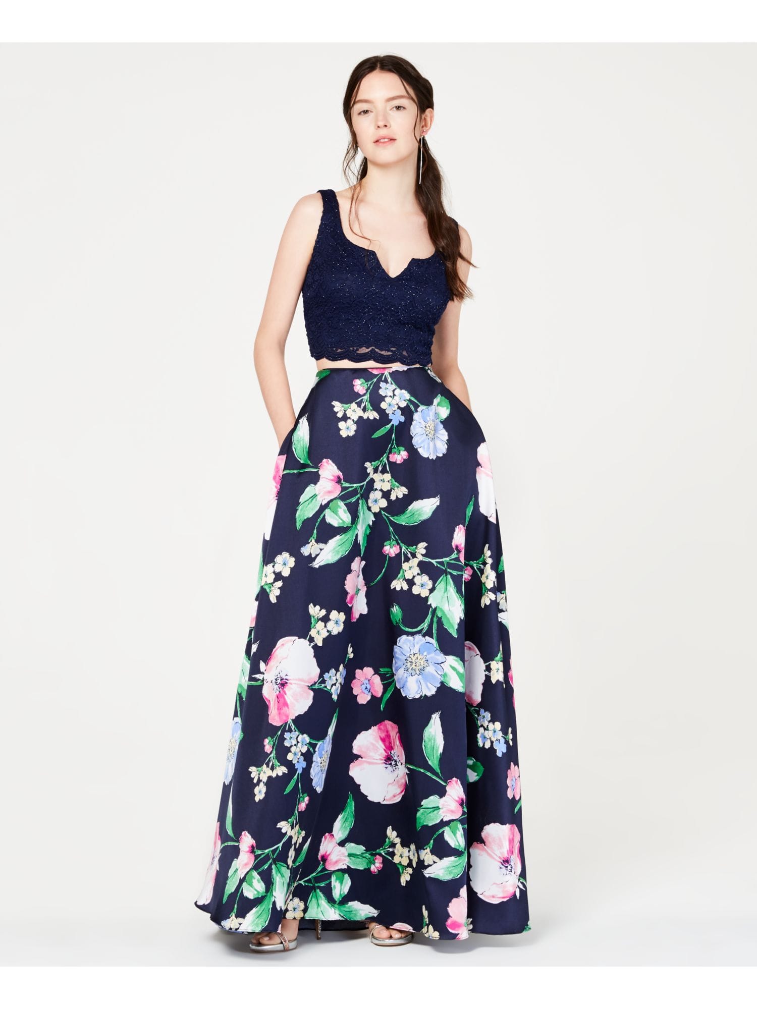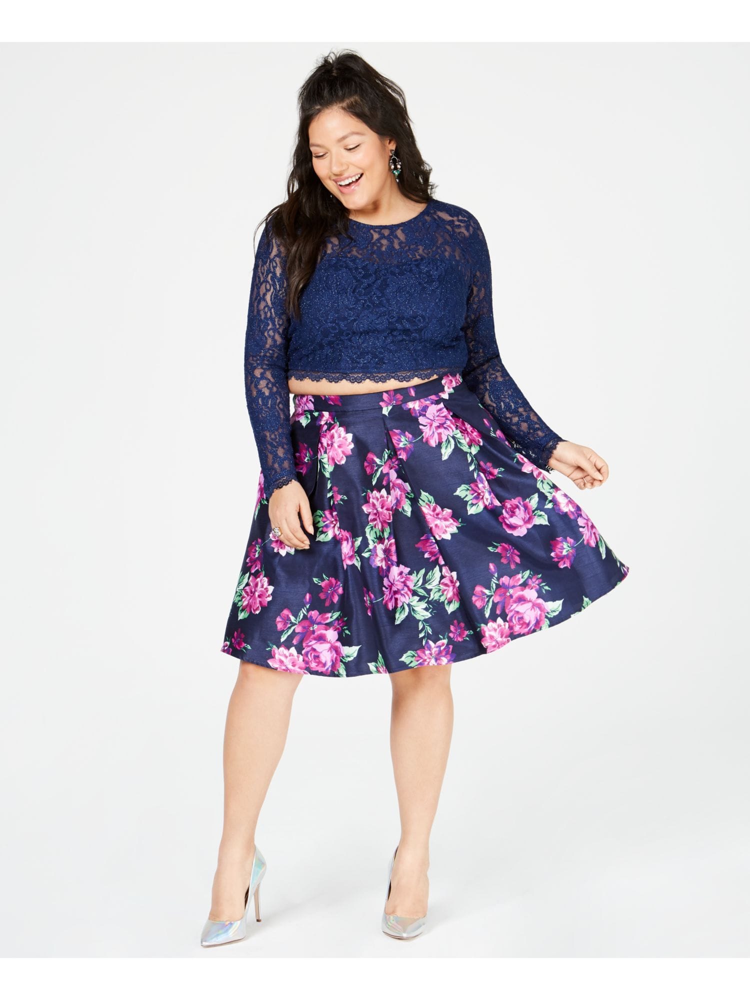 10154080 SEQUIN HEARTS $99 MSRP Womens Navy Lace Glitter Floral Long Sleeve Knee Length Prom Bubble Dress 18