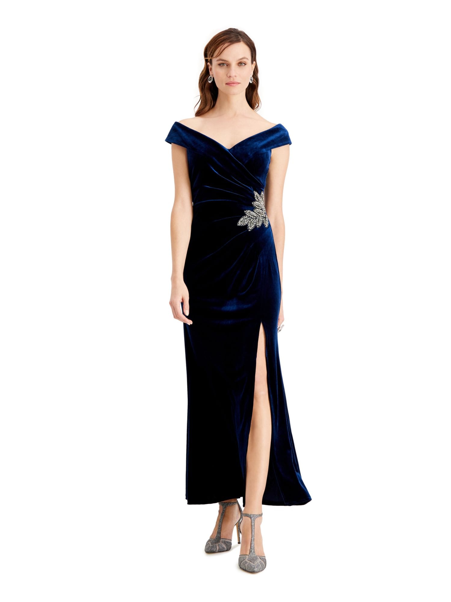 10210581 ALEX EVENINGS $239 MSRP Womens Navy Short Sleeve Off Shoulder Maxi Evening Sheath Dress 16