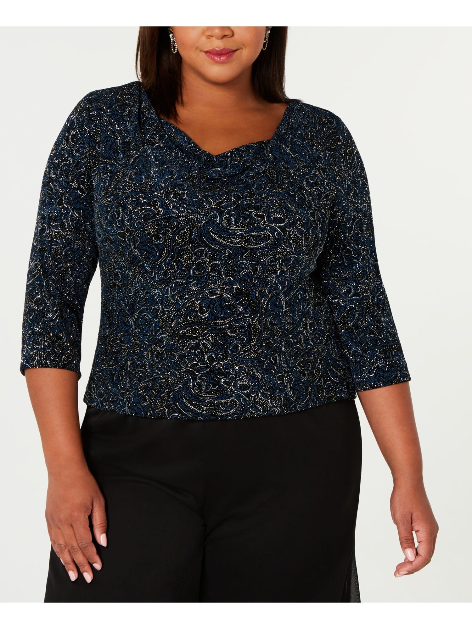 10222526 ALEX EVENINGS $129 MSRP Womens Black Glitter Printed 3/4 Sleeve Cowl Neck Formal Top Plus 1X